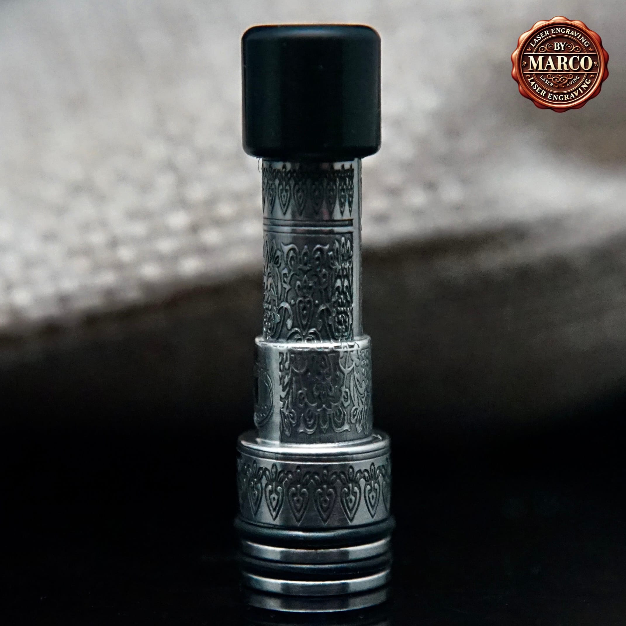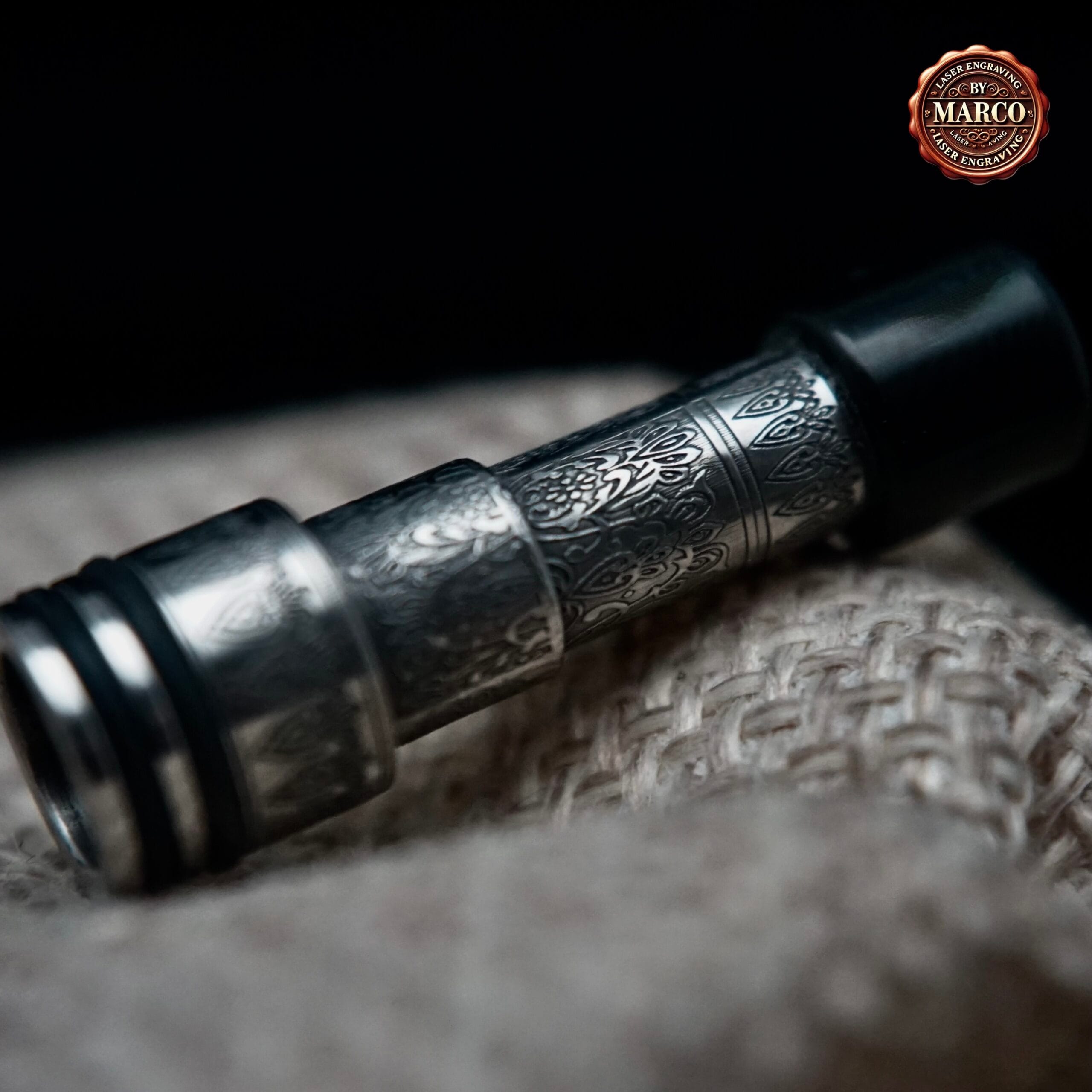 La particolarità di questa lavorazione è la sua “vita” sotto la luce: a seconda dell’angolo, l’incisione si ammorbidisce e può quasi scomparire, poi torna netta appena ruoti il tip, creando un effetto dinamico e raffinato. È un accessorio perfetto sia per completare una combo Minister, sia come elemento singolo per rendere unico un setup MTL.