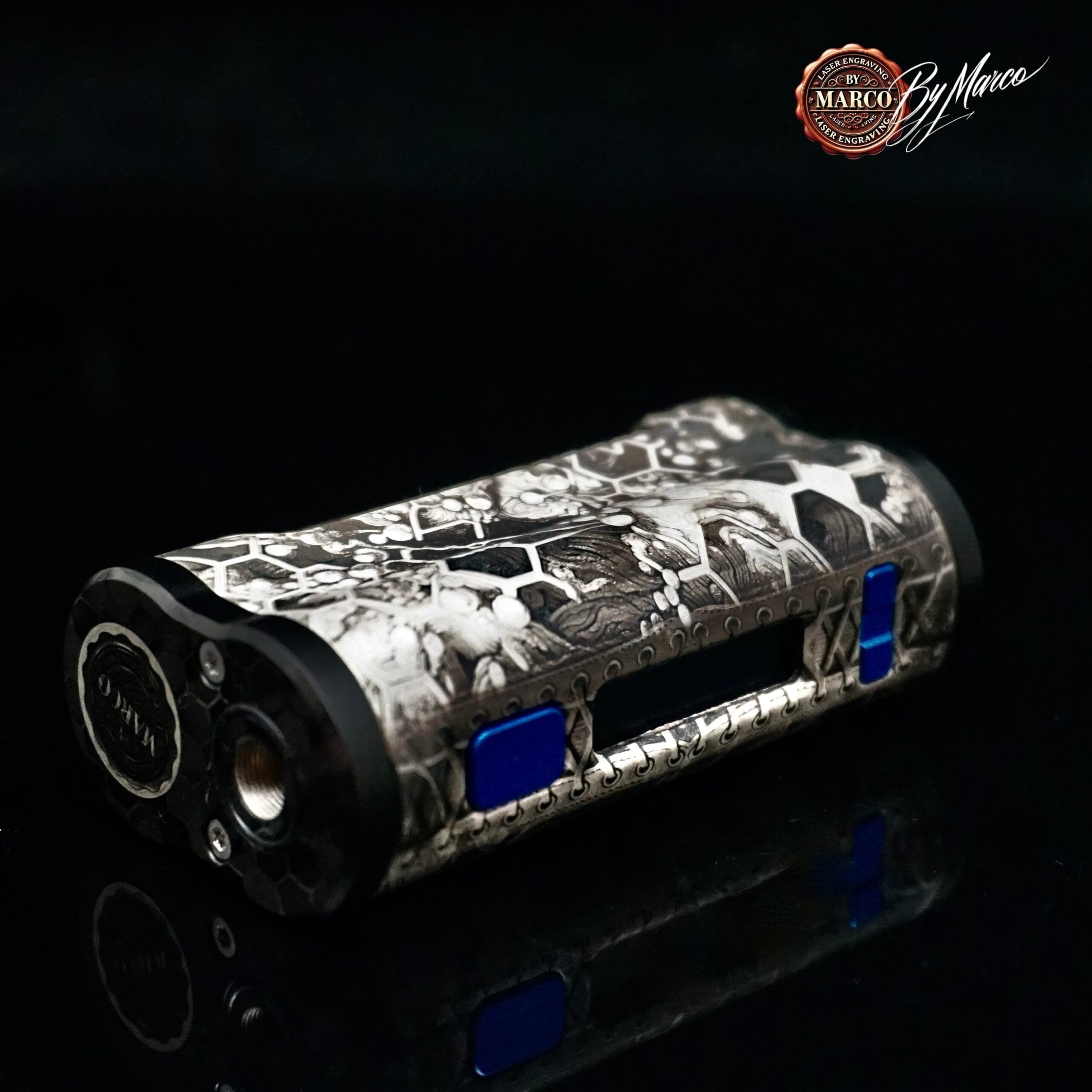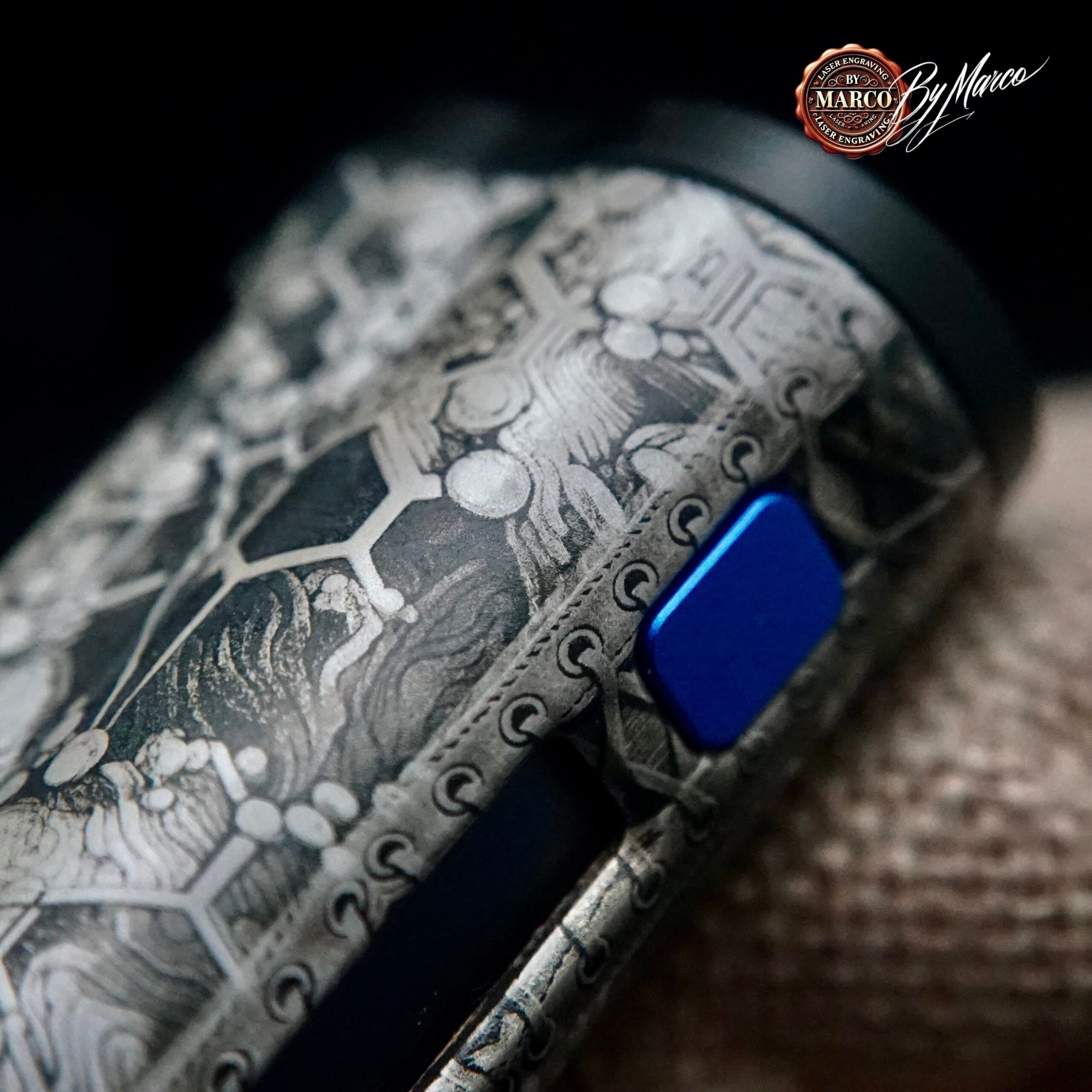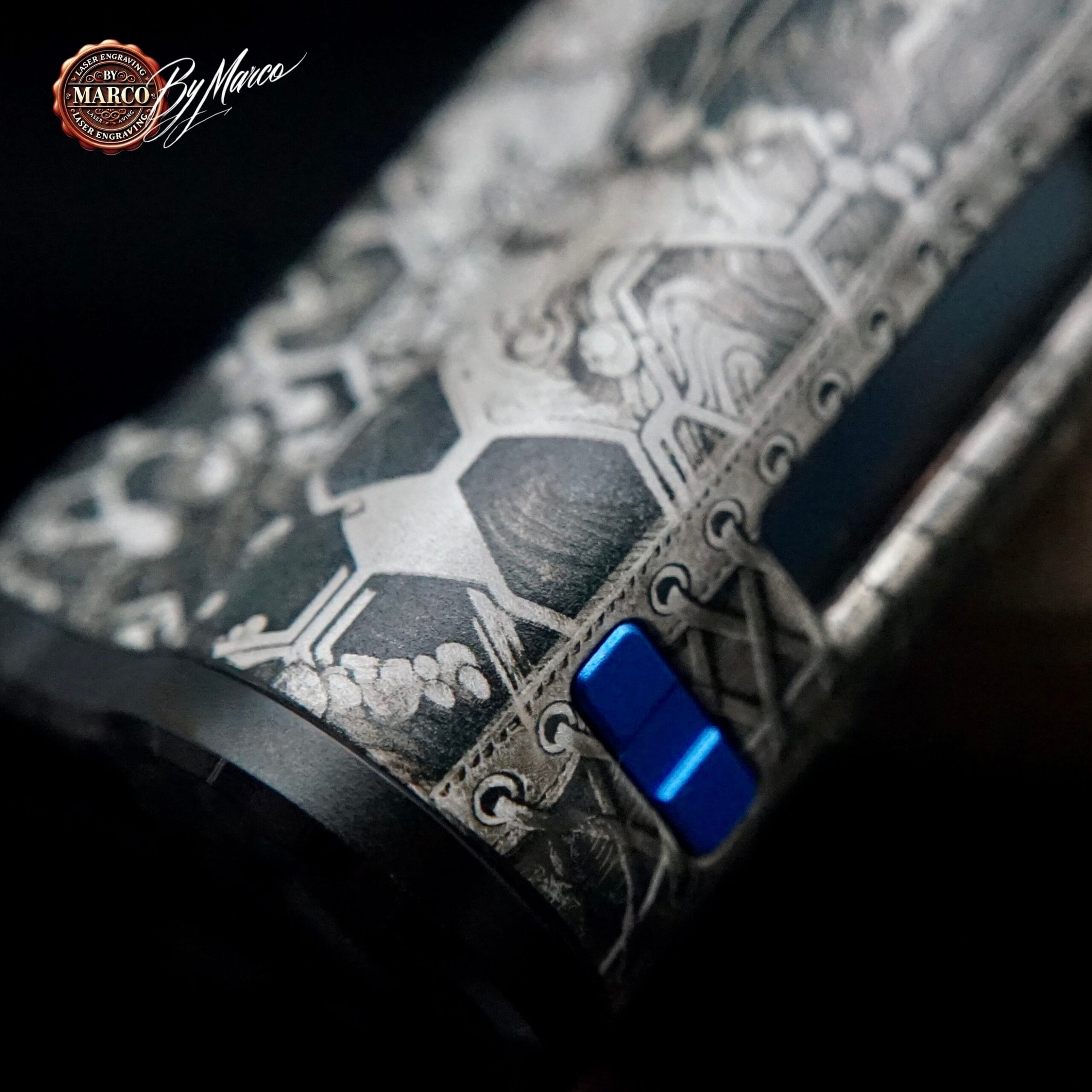 Uno degli aspetti più particolari di questa creazione è il contrasto tra le aree incise e le parti più scure, che amplifica la presenza del soggetto senza appesantire la linea generale della box. Il risultato è elegante ma deciso, ricercato ma aggressivo al punto giusto. I pulsanti blu, con la loro finitura brillante, spezzano volutamente la palette neutra e diventano un elemento distintivo che attira subito lo sguardo.