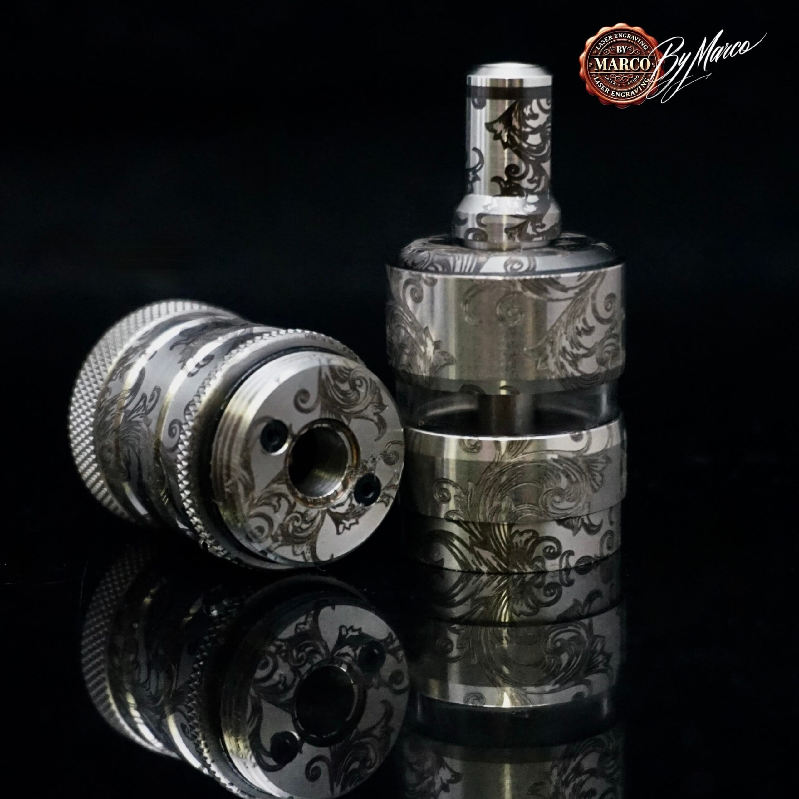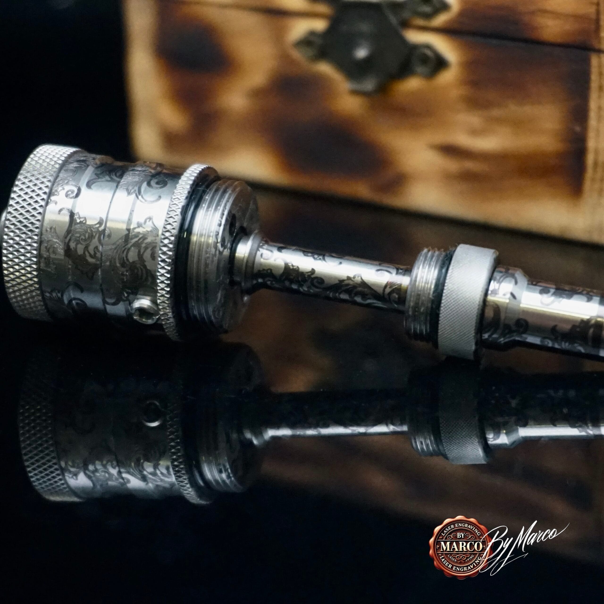 In questa interpretazione il progetto ruota attorno a un’incisione ispirata alle volute classiche e ai motivi arabescati, sviluppata per accompagnare la forma dell’atomizzatore senza appesantirla, ma anzi esaltandone linee, proporzioni e dettagli meccanici.