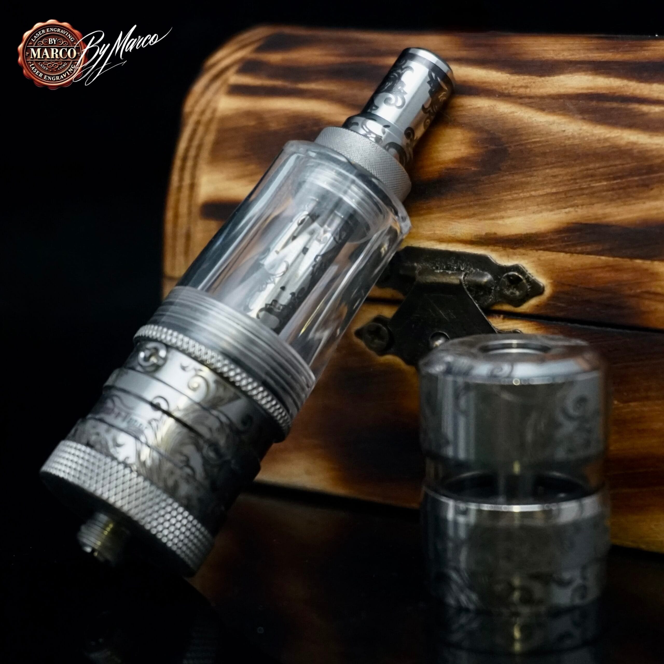 La lavorazione incisa corre con continuità sulle varie sezioni del FeV, creando un linguaggio visivo uniforme e ben distribuito. Le superfici metalliche vengono arricchite da un disegno elegante, fatto di curve, richiami floreali e intrecci ornamentali che dialogano con la finitura dell’acciaio e con le parti zigrinate del corpo. Il risultato è un equilibrio molto particolare tra tecnica e decorazione: un atomizzatore dall’anima funzionale che assume l’aspetto di un oggetto quasi da collezione.
