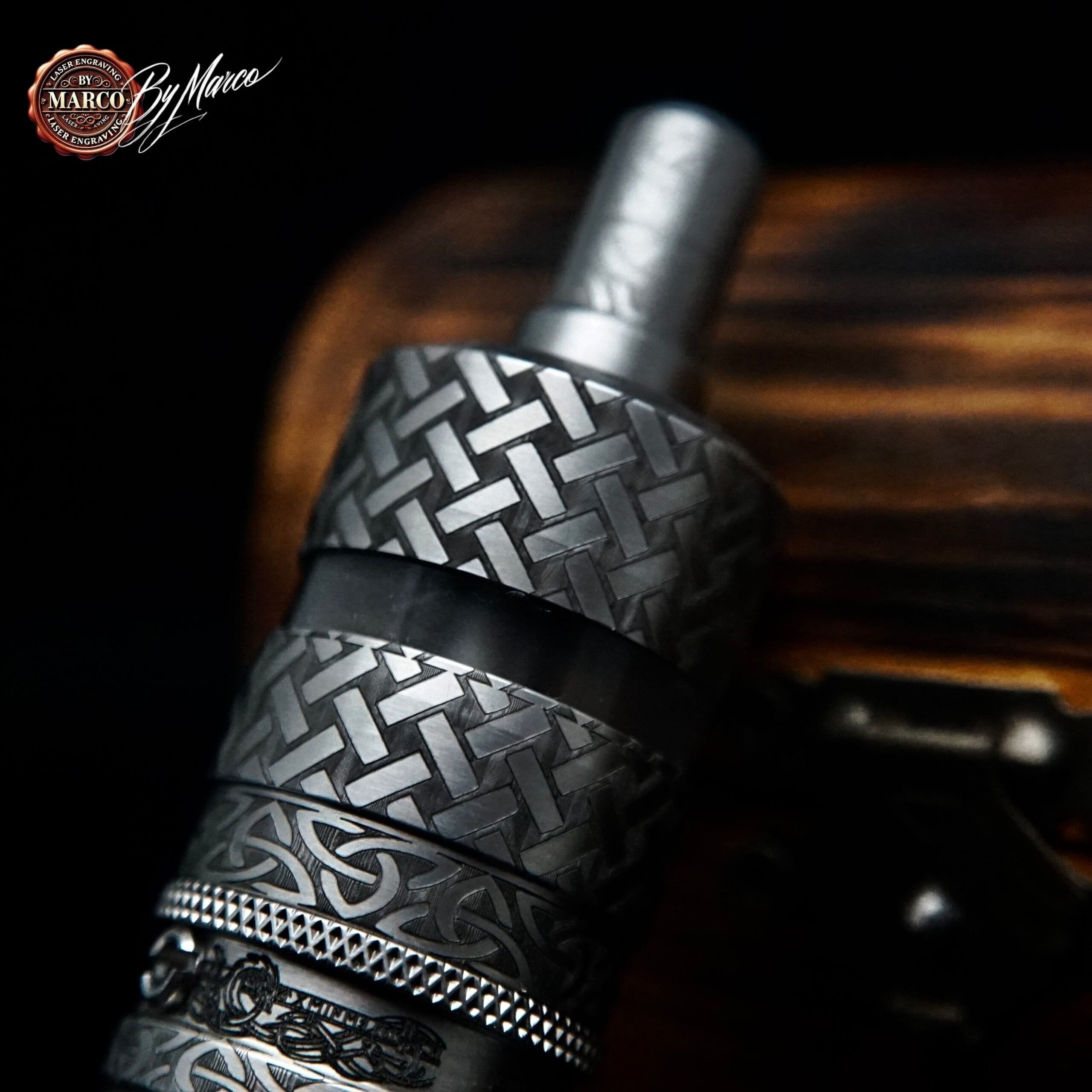 L’intervento si sviluppa sull’intera superficie dell’atomizzatore, seguendo una logica compositiva precisa. Le fasce principali presentano un motivo intrecciato dal carattere geometrico, forte e ordinato, che dona struttura e impatto alla parte centrale del pezzo. A questo si affiancano lavorazioni ornamentali più morbide e fluide, inserite per creare contrasto e alleggerire visivamente l’insieme. Questo dialogo tra pattern tecnici e motivi decorativi permette al prodotto di esprimere una doppia anima: da un lato robusta, meccanica e incisiva; dall’altro elegante, ricercata e quasi scultorea.