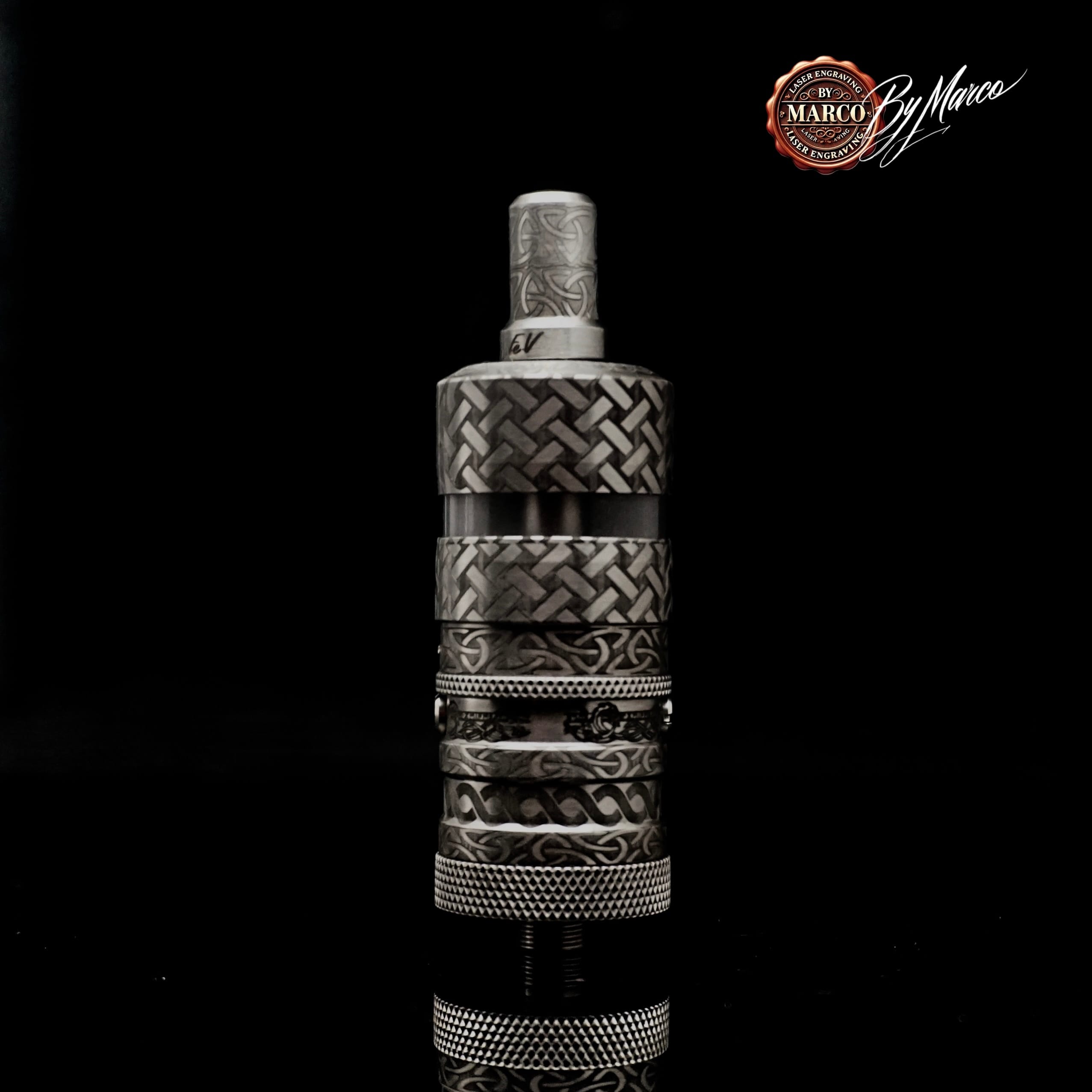 Il drip tip segue il progetto con coerenza, riprendendo la stessa impostazione decorativa e completando il profilo dell’atomizzatore con una finitura armonica. Questo aiuta a rendere il lavoro omogeneo, senza interruzioni stilistiche, e rafforza la sensazione di trovarsi di fronte a un oggetto pensato nel dettaglio e non a una semplice modifica casuale. Anche le varie sezioni dell’atomizzatore dialogano tra loro attraverso un’alternanza di texture e incisioni che costruiscono una firma visiva ben precisa.