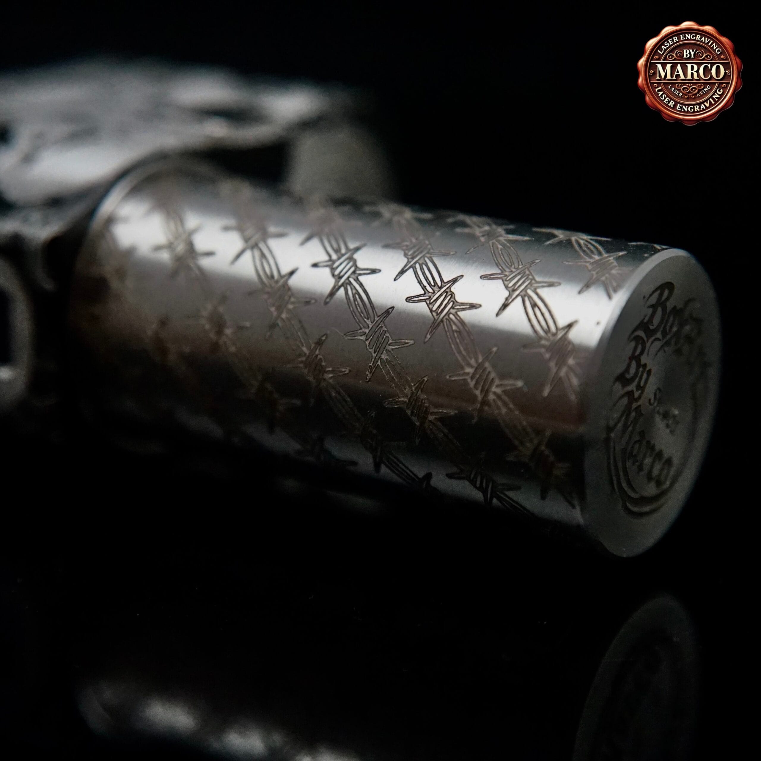 La “Skull Reaper” nasce dalla base Empira ma viene trasformata in un pezzo unico grazie a un’incisione totale che avvolge l’intero corpo. Il tema scelto è quello dei teschi avvolti dal fumo, un disegno oscuro e profondo che cattura subito lo sguardo. Ogni dettaglio è stato esaltato dalla lucidatura manuale, che dona un contrasto netto tra le superfici lucide e le zone incise, mettendo in risalto i lineamenti più marcati.