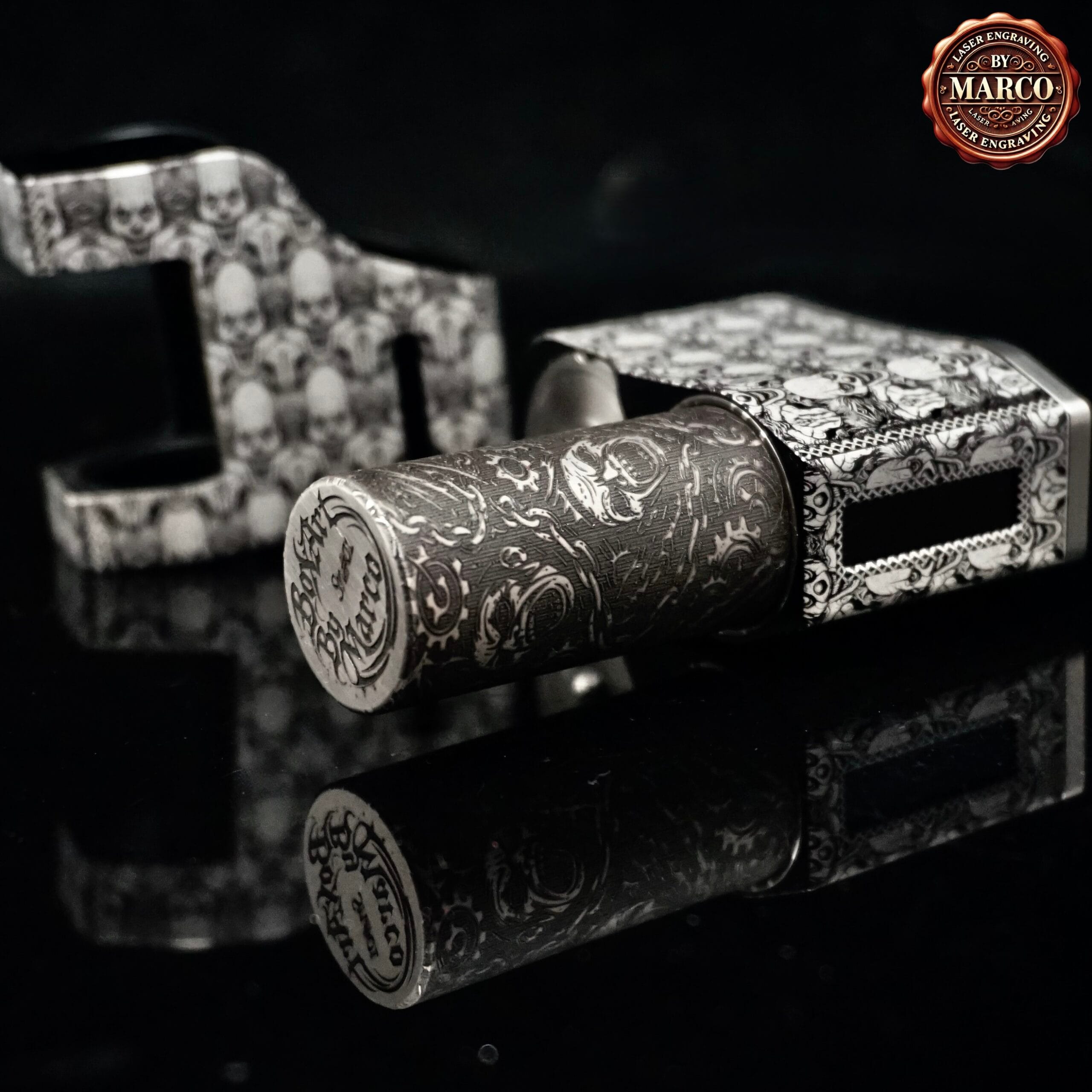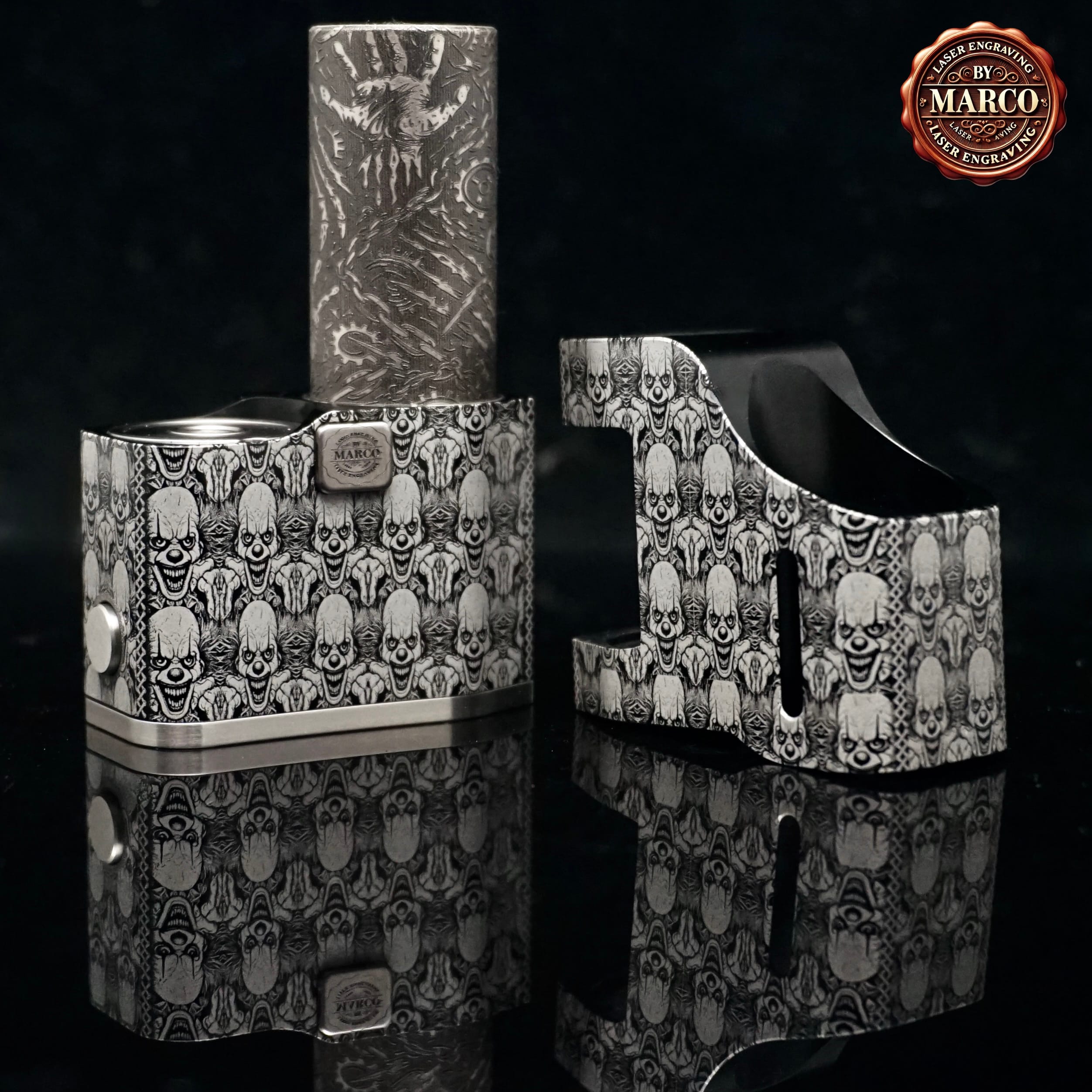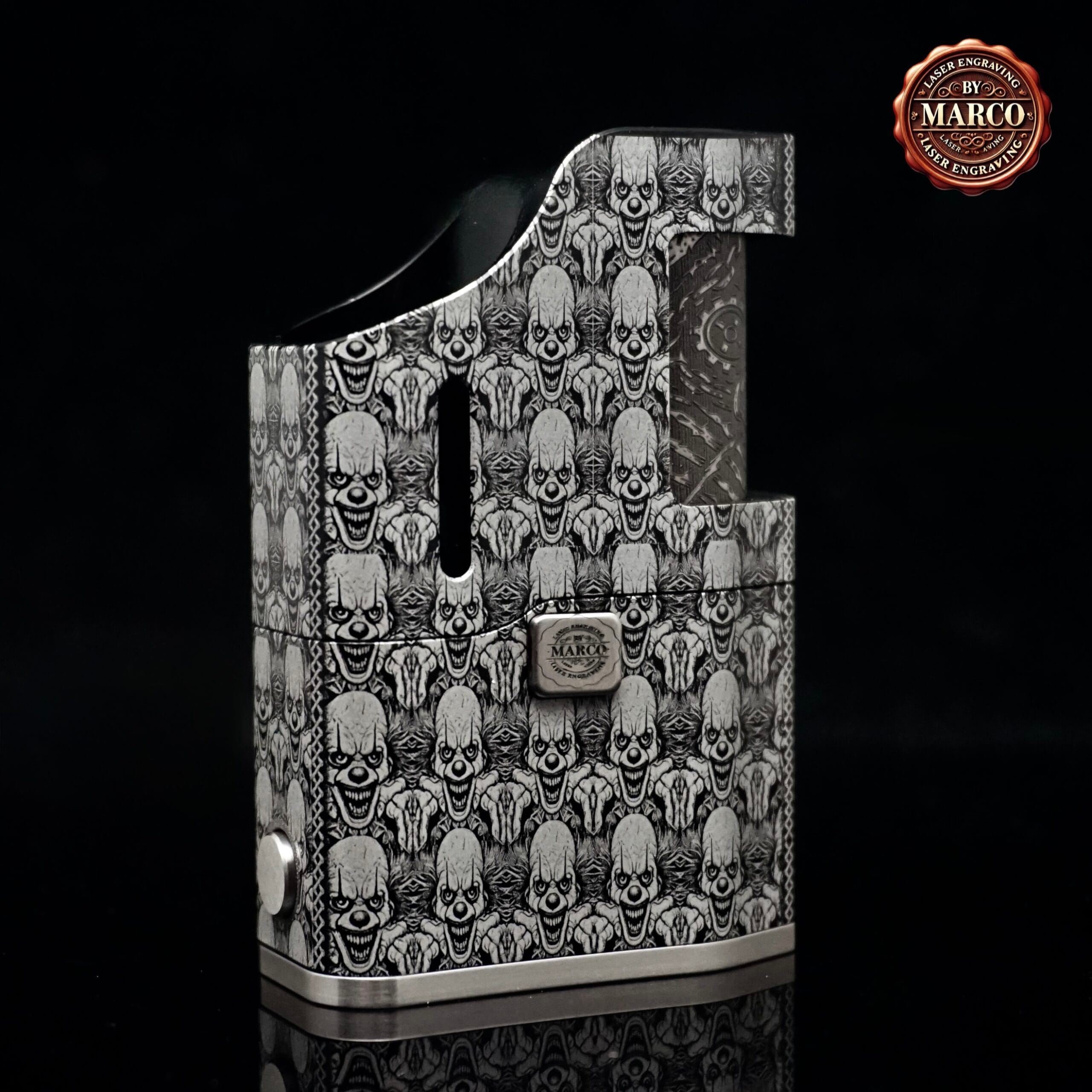 Il corpo, interamente, è ricoperto da un pattern fitto di volti demoniaci che sembrano emergere dal metallo, creando un effetto tridimensionale di grande impatto. Ogni dettaglio è stato inciso in profondità con tecnologia laser a fibra, poi lucidato e rifinito a mano per ottenere un contrasto netto tra le superfici lucide e le zone brunite.
