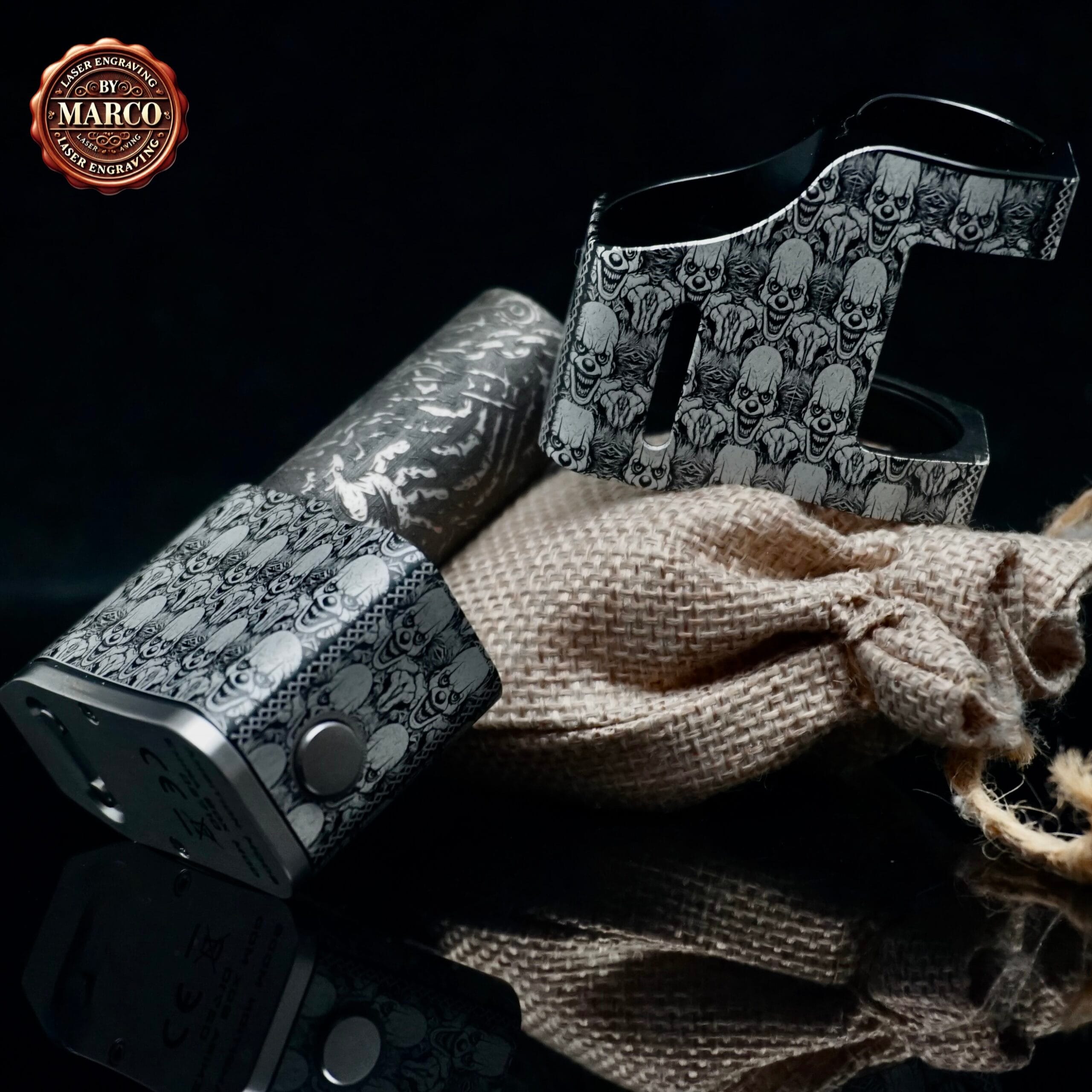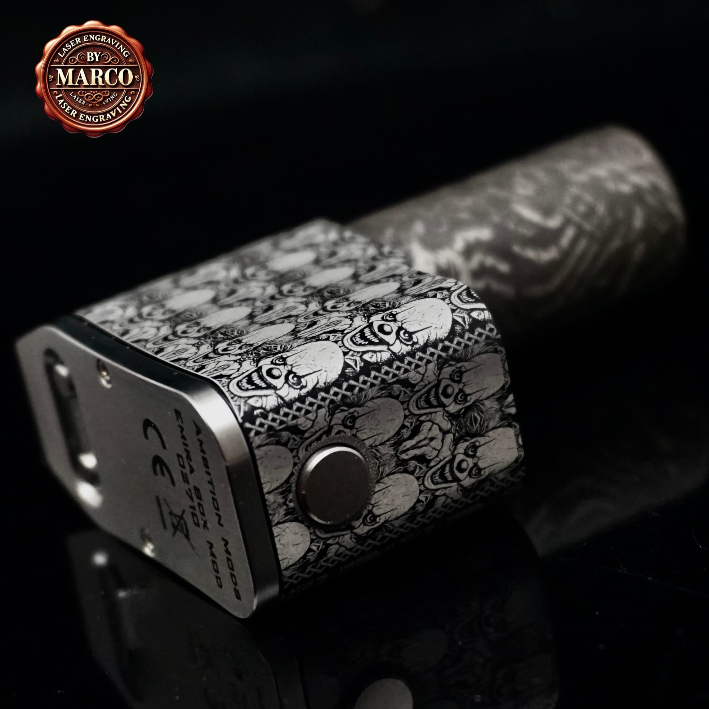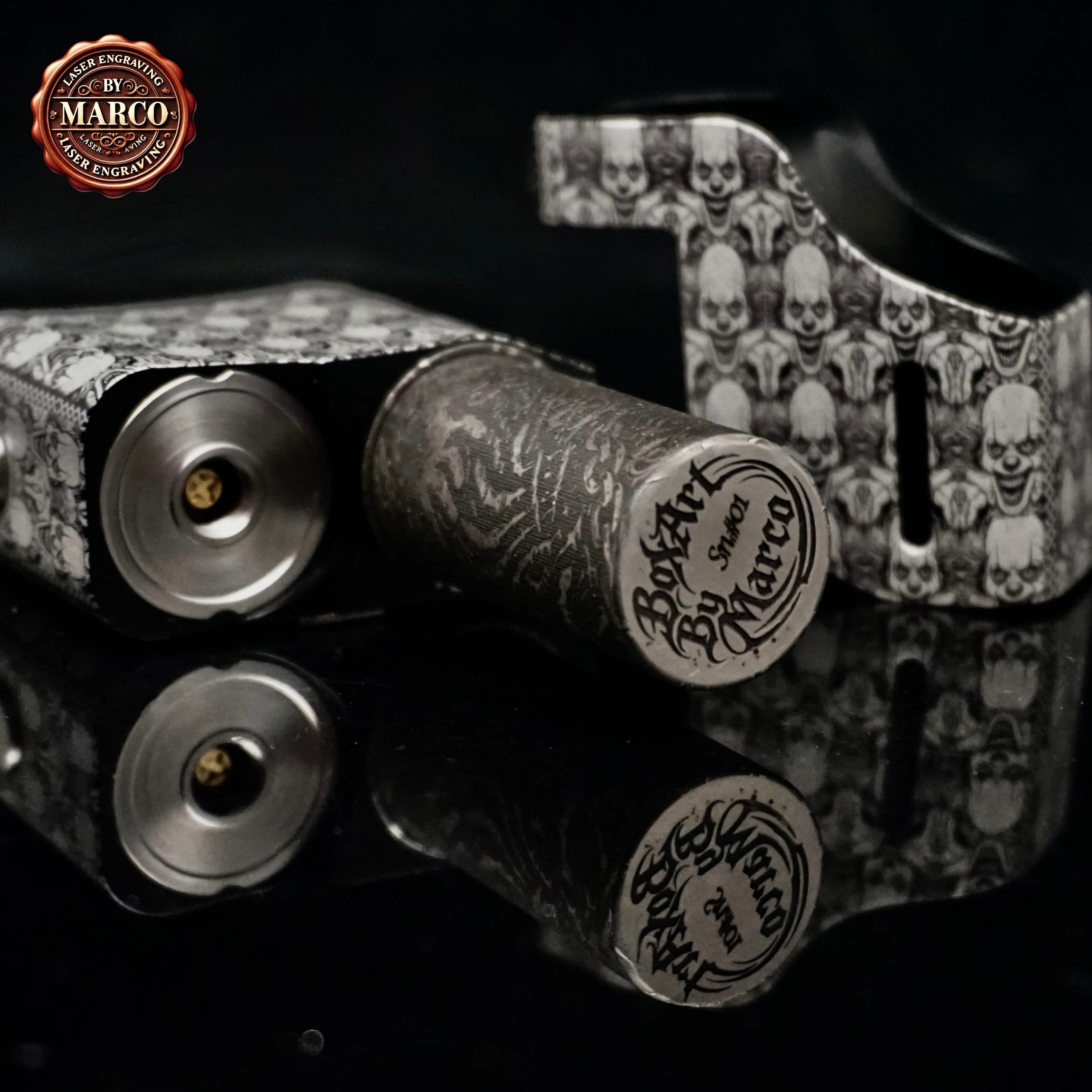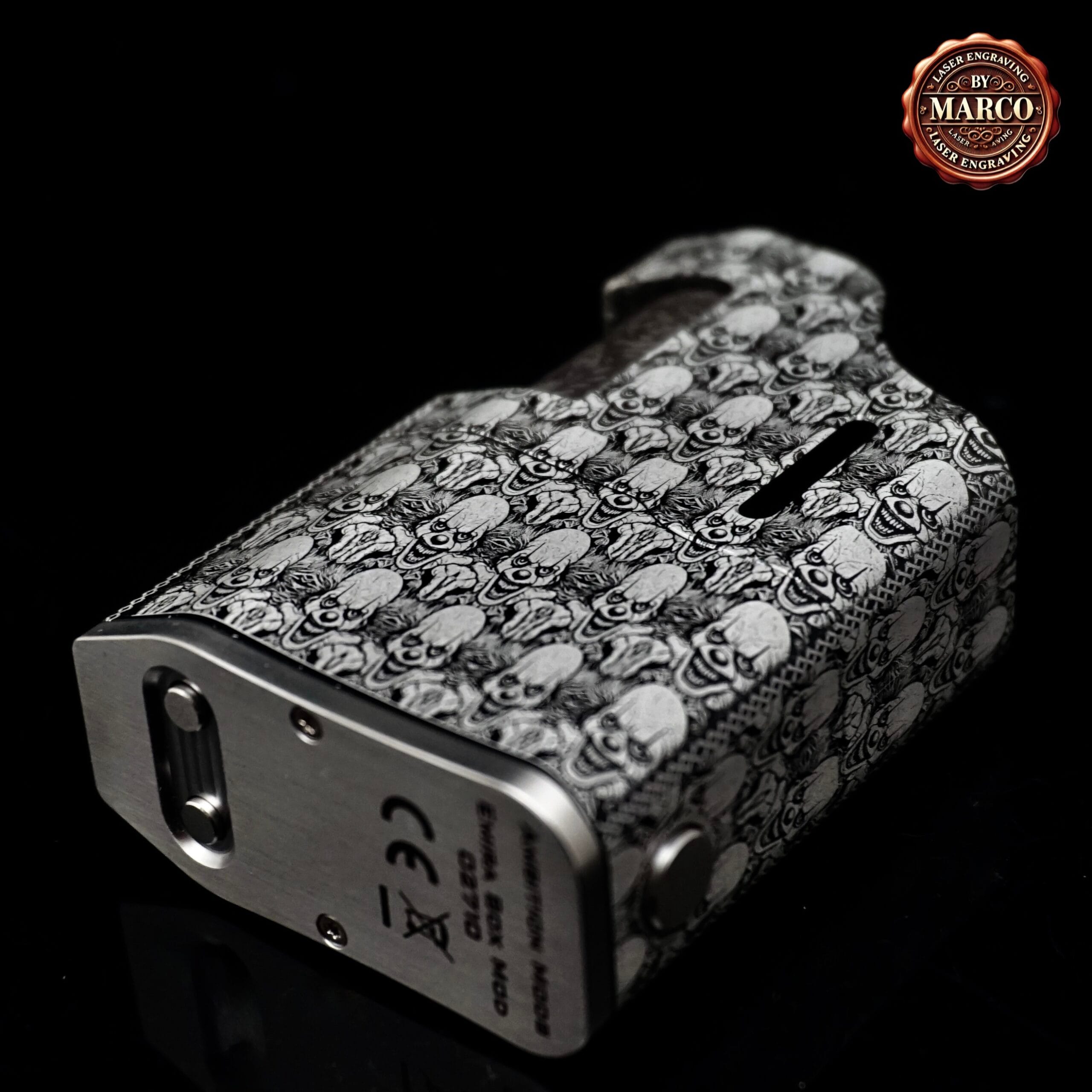Il corpo, interamente, è ricoperto da un pattern fitto di volti demoniaci che sembrano emergere dal metallo, creando un effetto tridimensionale di grande impatto. Ogni dettaglio è stato inciso in profondità con tecnologia laser a fibra, poi lucidato e rifinito a mano per ottenere un contrasto netto tra le superfici lucide e le zone brunite.