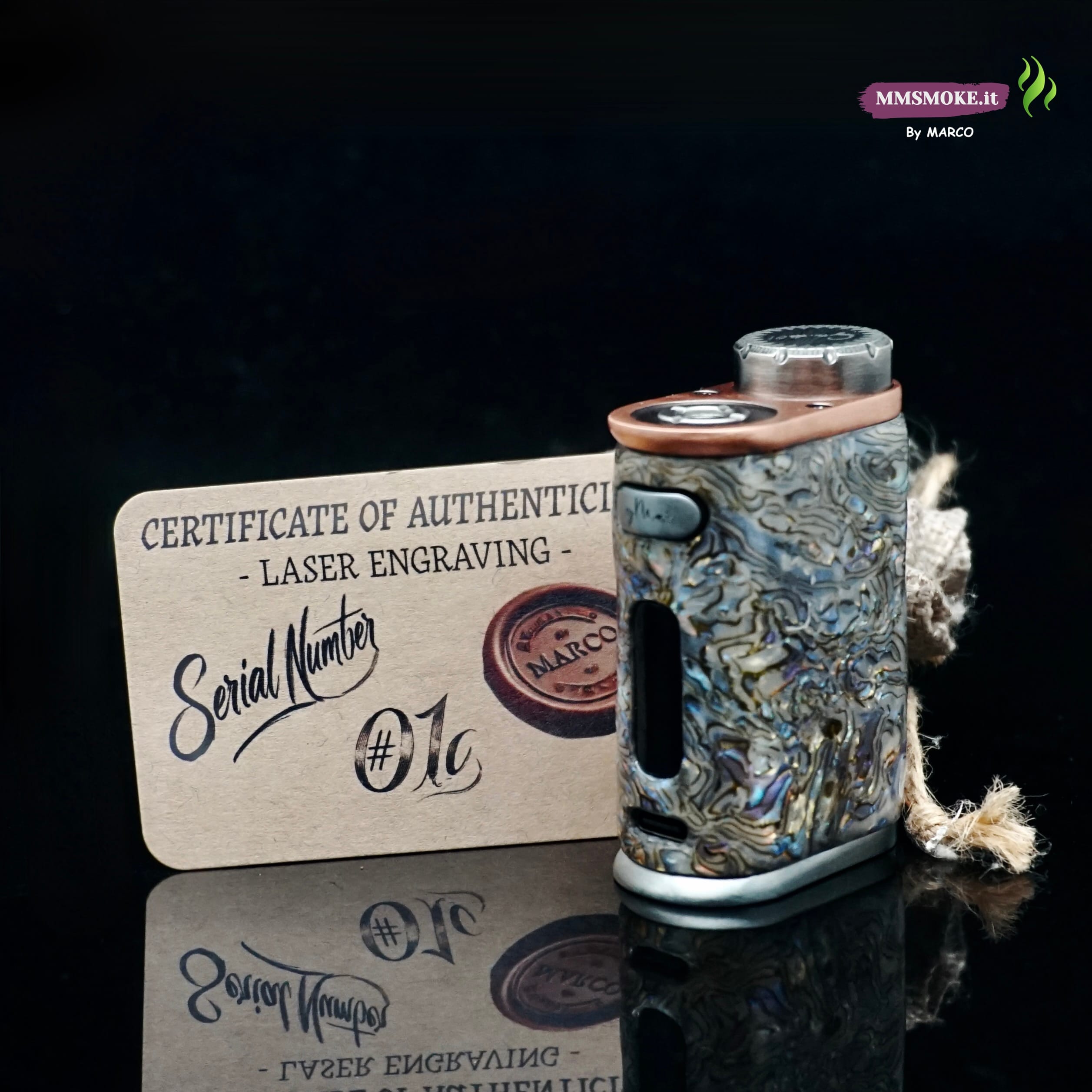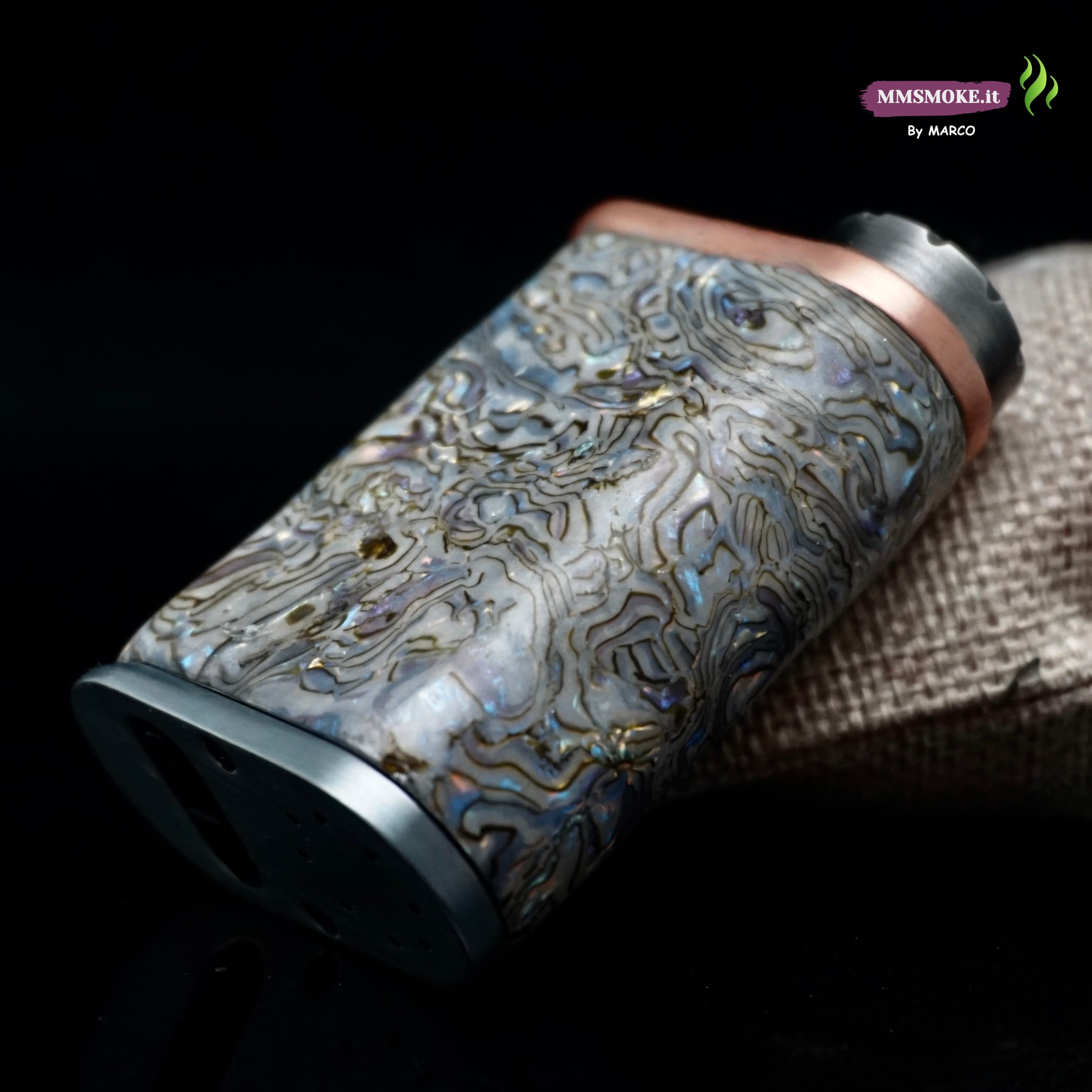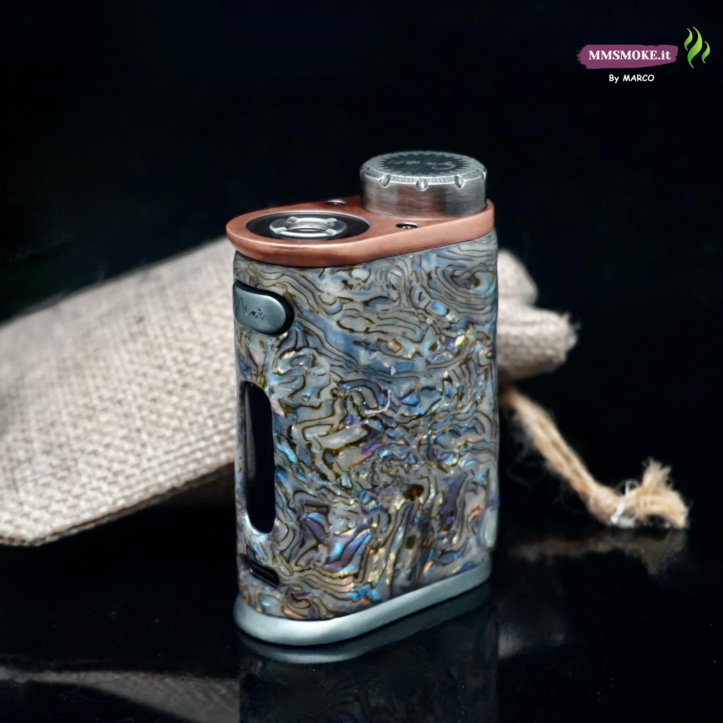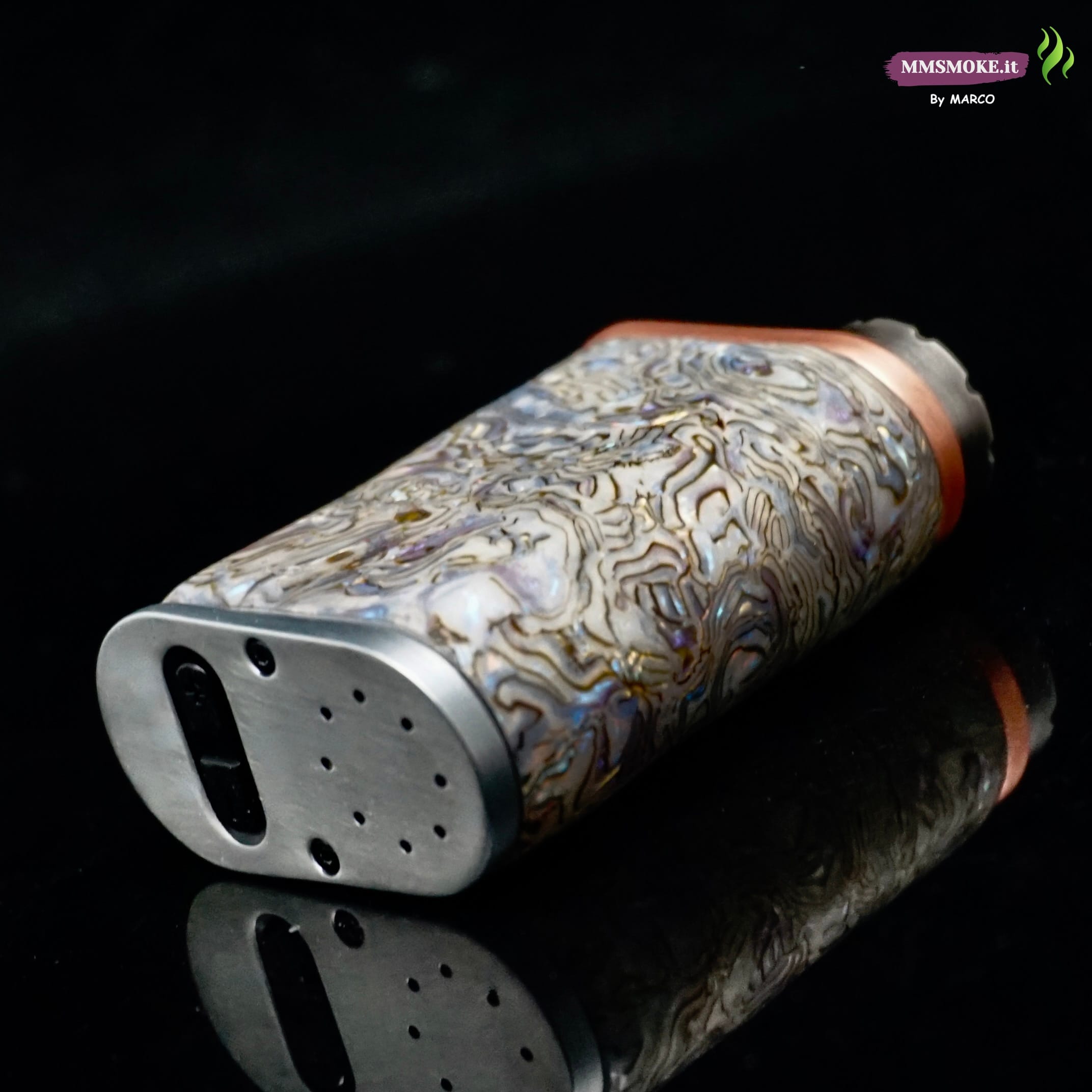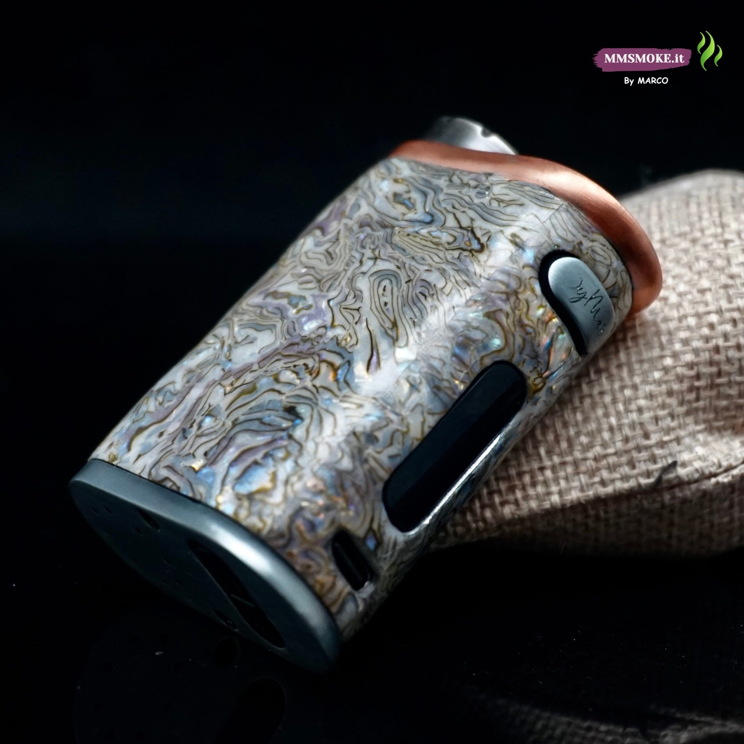 La Box Corall nasce dalla base Pico Plus e si trasforma in un pezzo unico grazie al rivestimento in madreperla impagliata, selezionata e posata a mano per creare un mosaico iridescente che richiama i fondali marini. A completare l’opera, uno strato di resina da gioielliere ne esalta profondità e riflessi, proteggendo la superficie da uso quotidiano e graffi. Profili metallici rifiniti e particolari curati completano un oggetto che è tanto funzionale quanto da collezione, firmato “By Marco”.