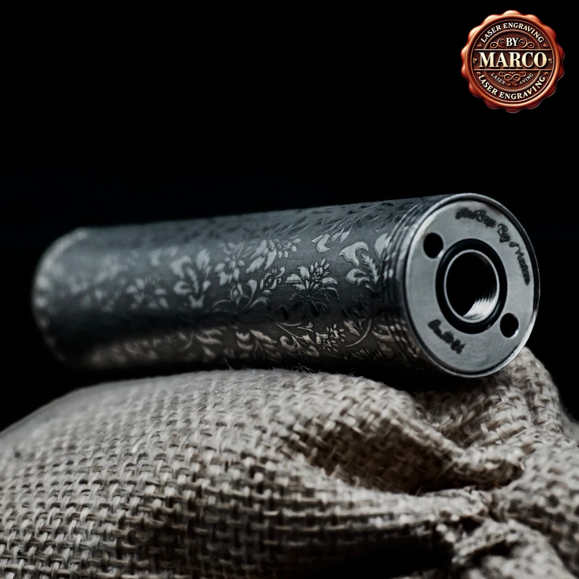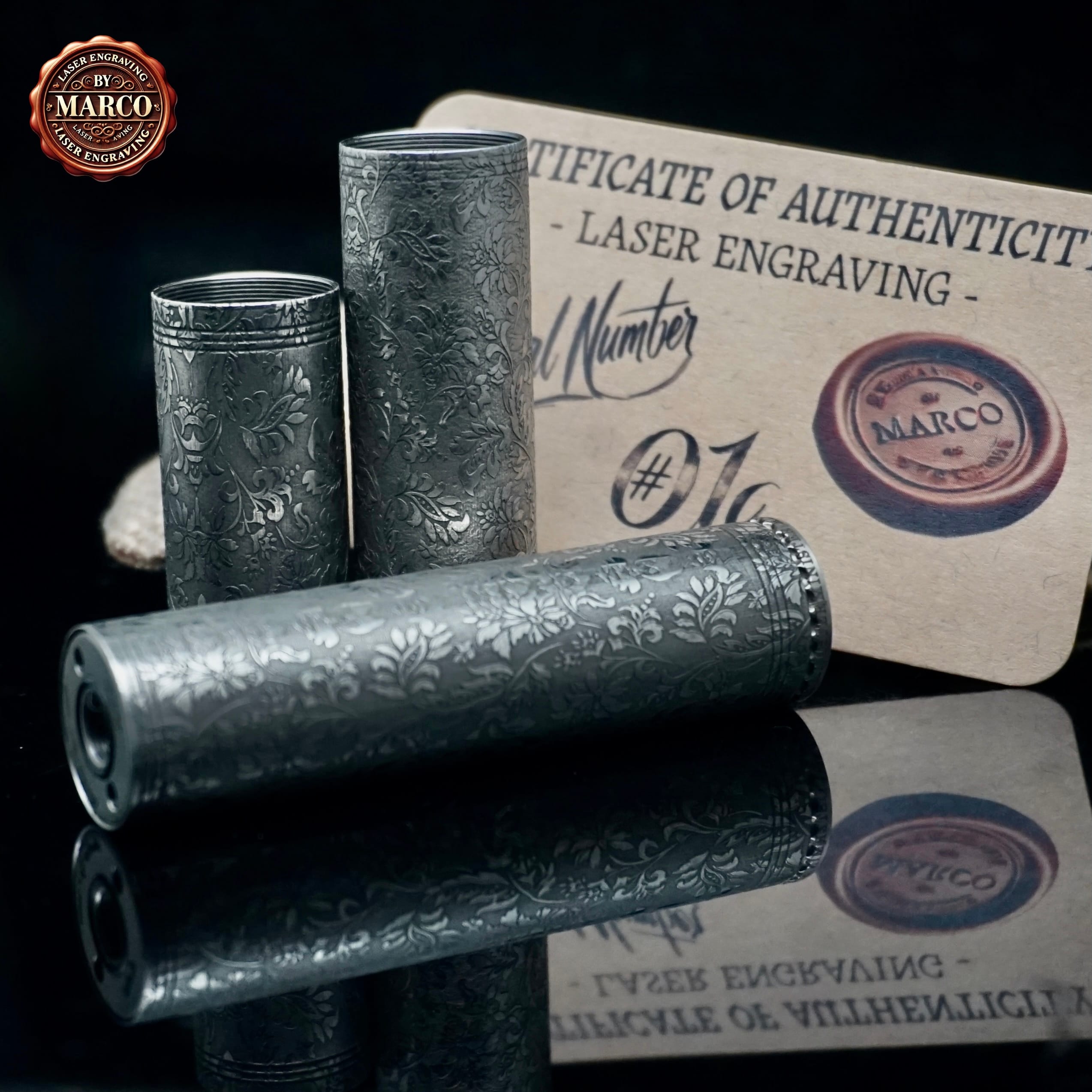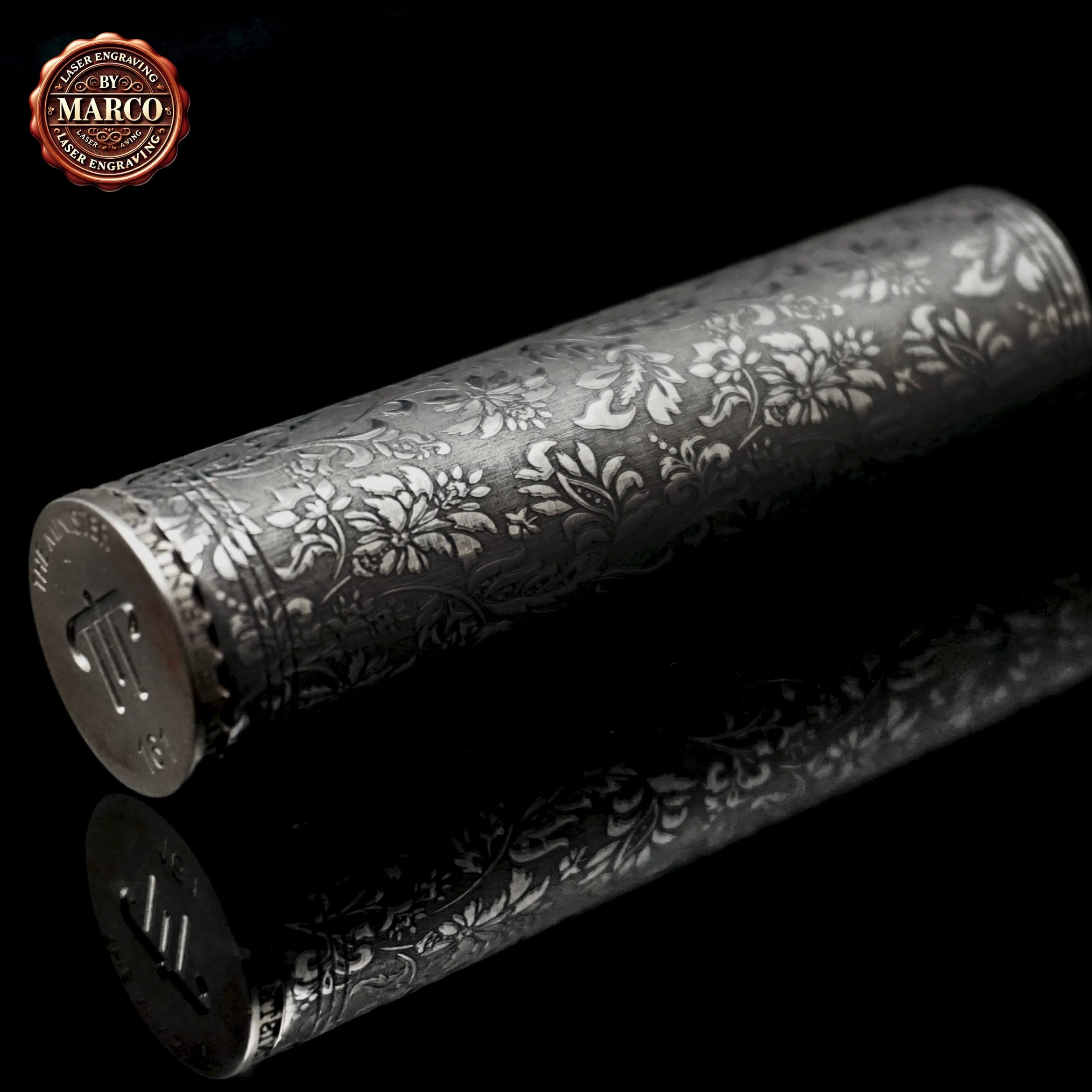 Kit Minister IV di Centenary Mods in 3 configurazioni (18350 / 18500 / 18650), trasformato in ArtBox By Marco con incisione laser integrale su acciaio: pattern floreale/ornamentale ricco di micro-dettagli, finitura scura profonda e riflessi “gioiello”. Pezzo da collezione con certificato di autenticità.
