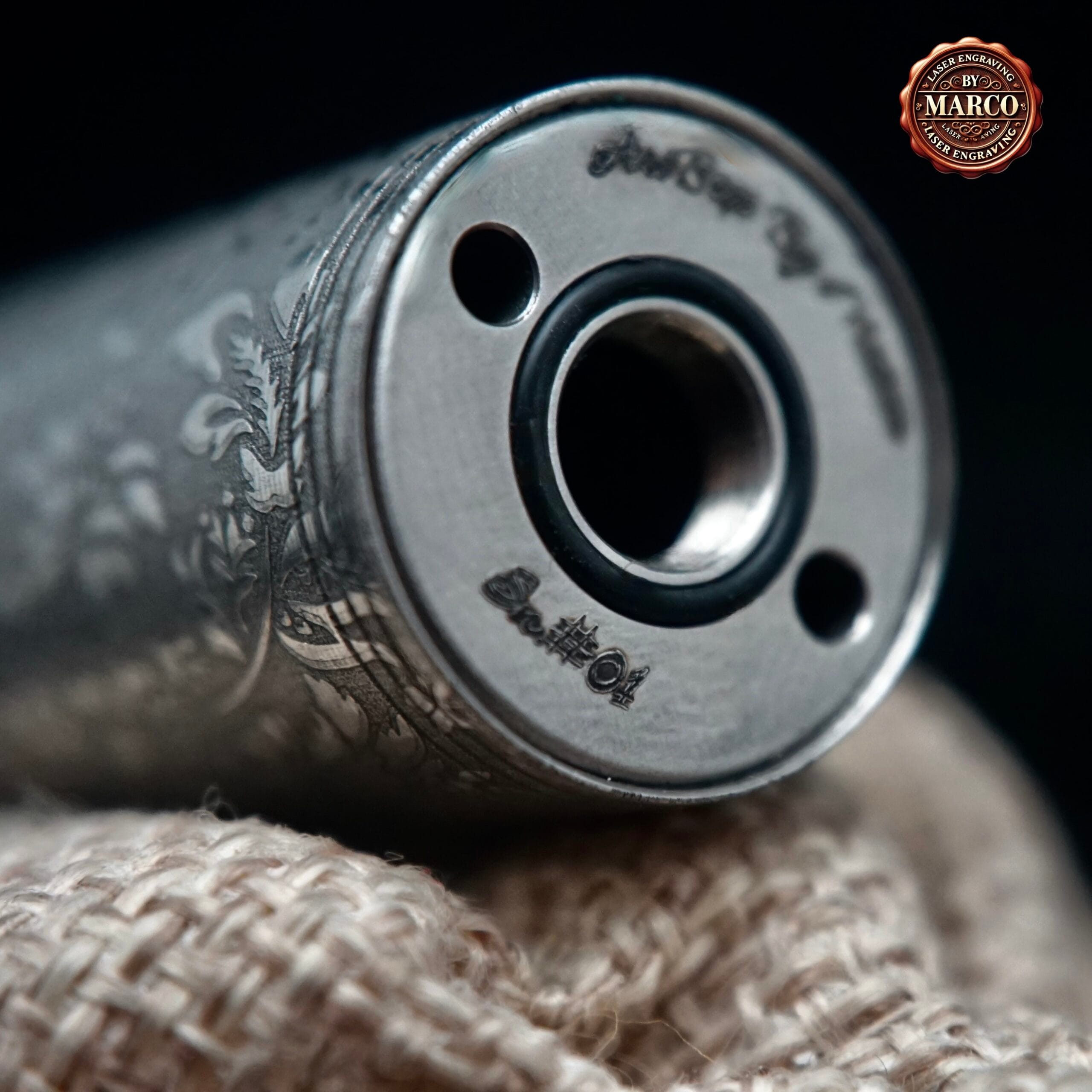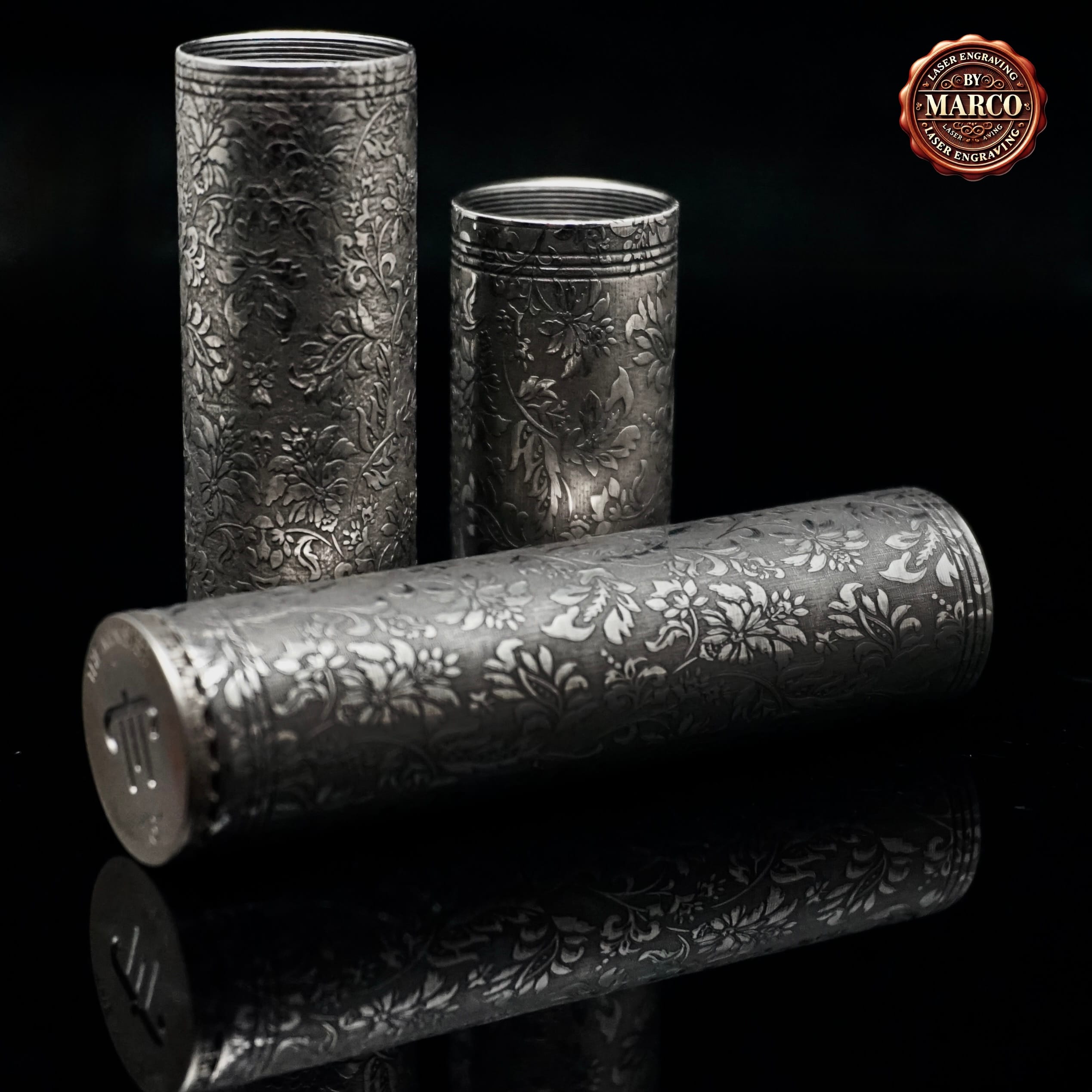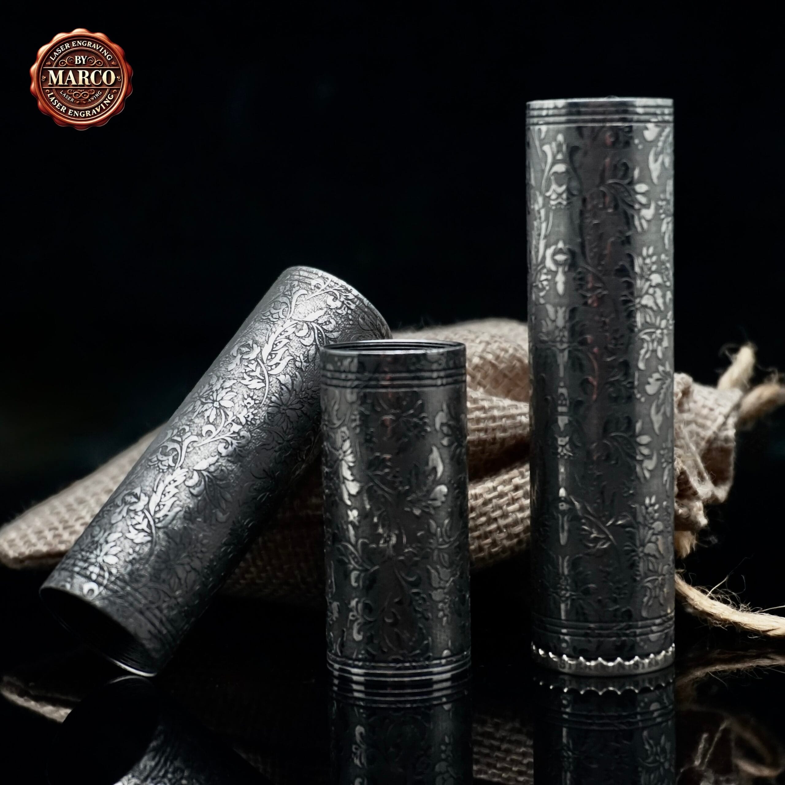 Kit Minister IV di Centenary Mods in 3 configurazioni (18350 / 18500 / 18650), trasformato in ArtBox By Marco con incisione laser integrale su acciaio: pattern floreale/ornamentale ricco di micro-dettagli, finitura scura profonda e riflessi “gioiello”. Pezzo da collezione con certificato di autenticità.