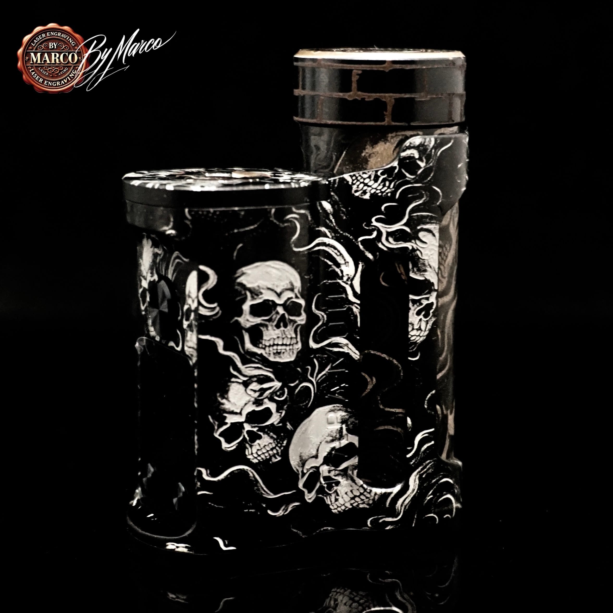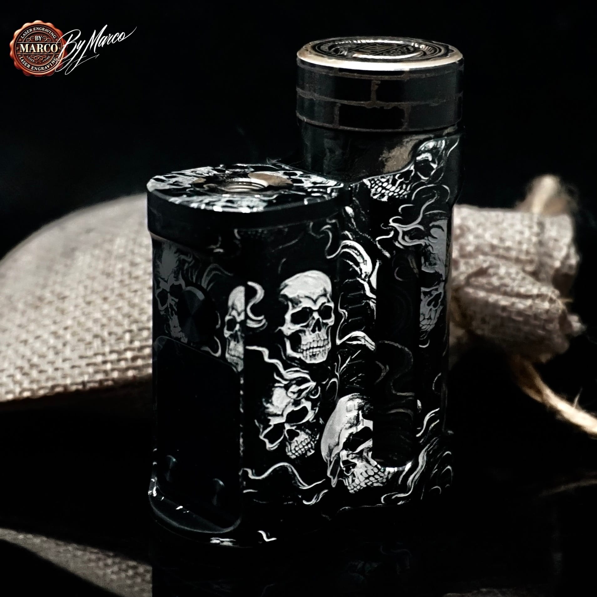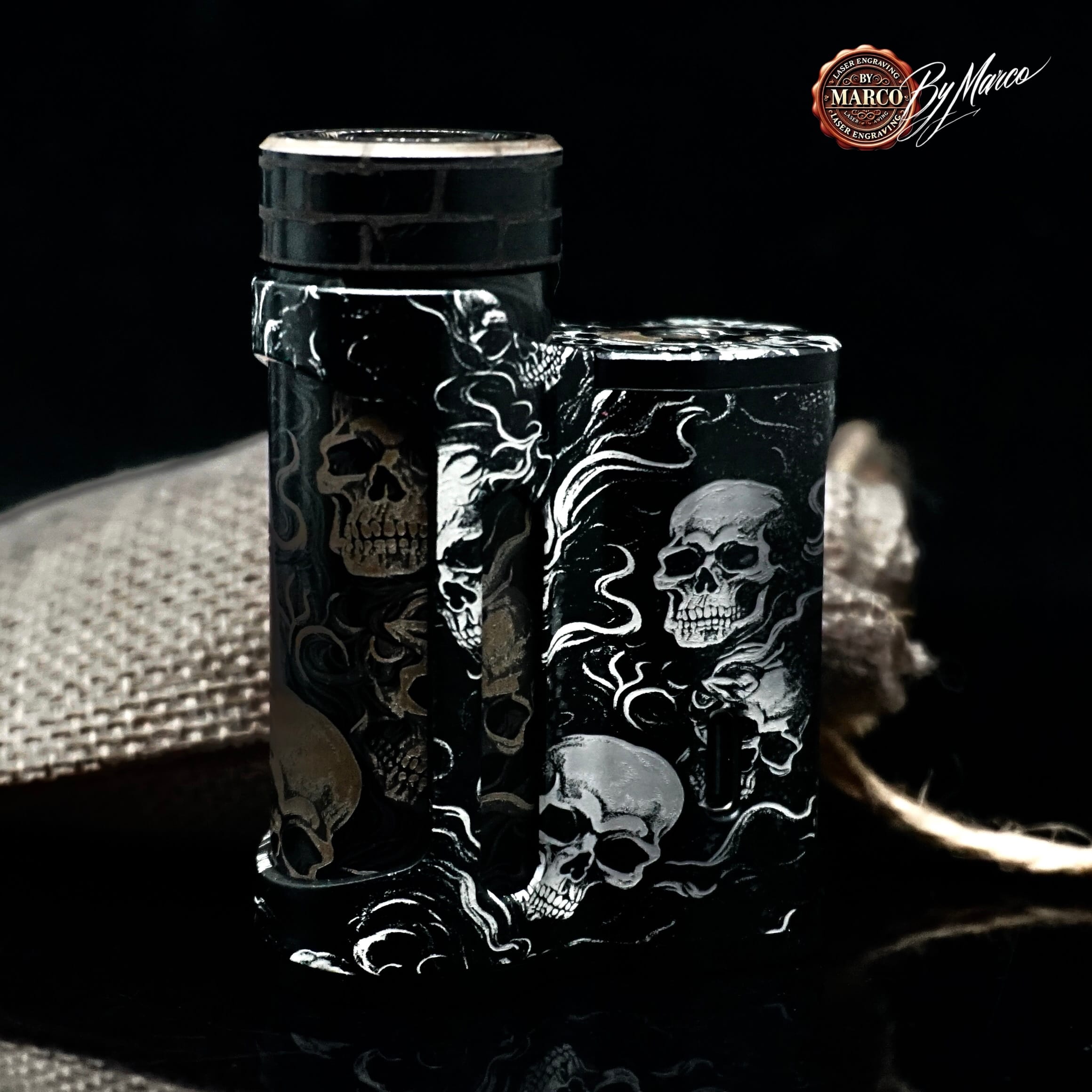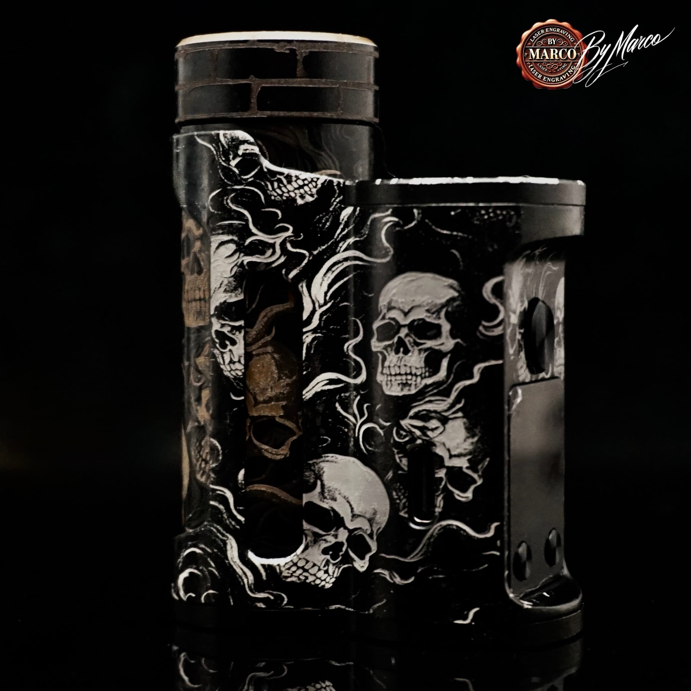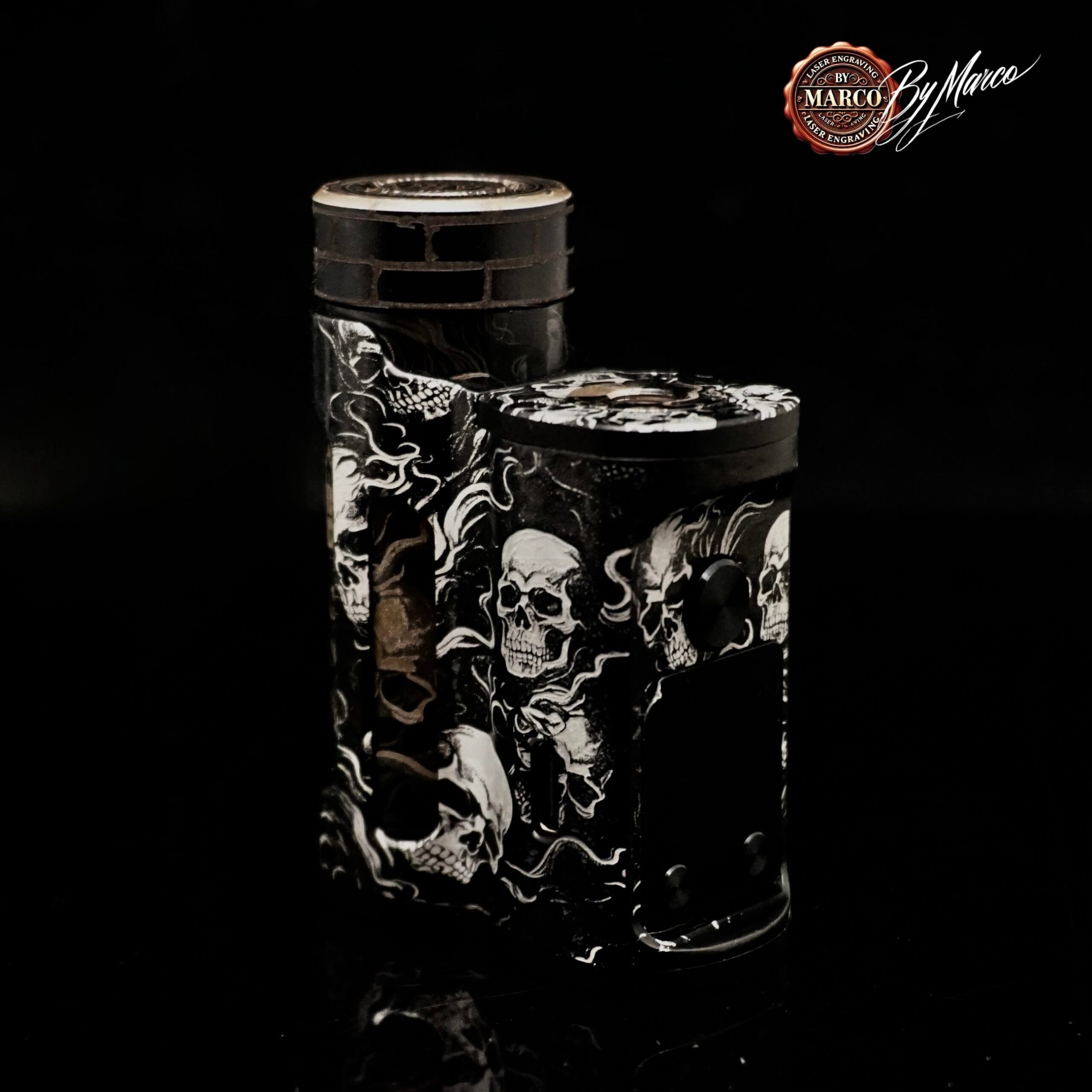 Il tema scelto è costruito attorno a una composizione di teschi e fumo che avvolge la box con andamento continuo e dinamico. I crani emergono dal fondo con una presenza netta, mentre le linee sinuose del fumo attraversano la struttura alleggerendo la composizione e creando movimento. Il risultato visivo è intenso, cupo e ricco di atmosfera, con un’estetica che richiama mondi dark, underground e metallici senza perdere eleganza formale.