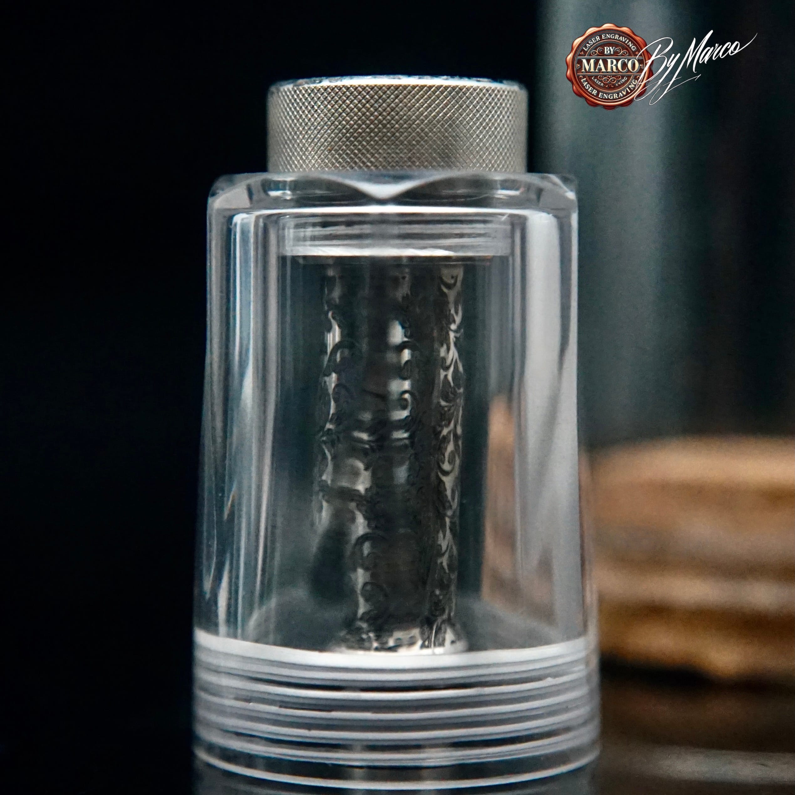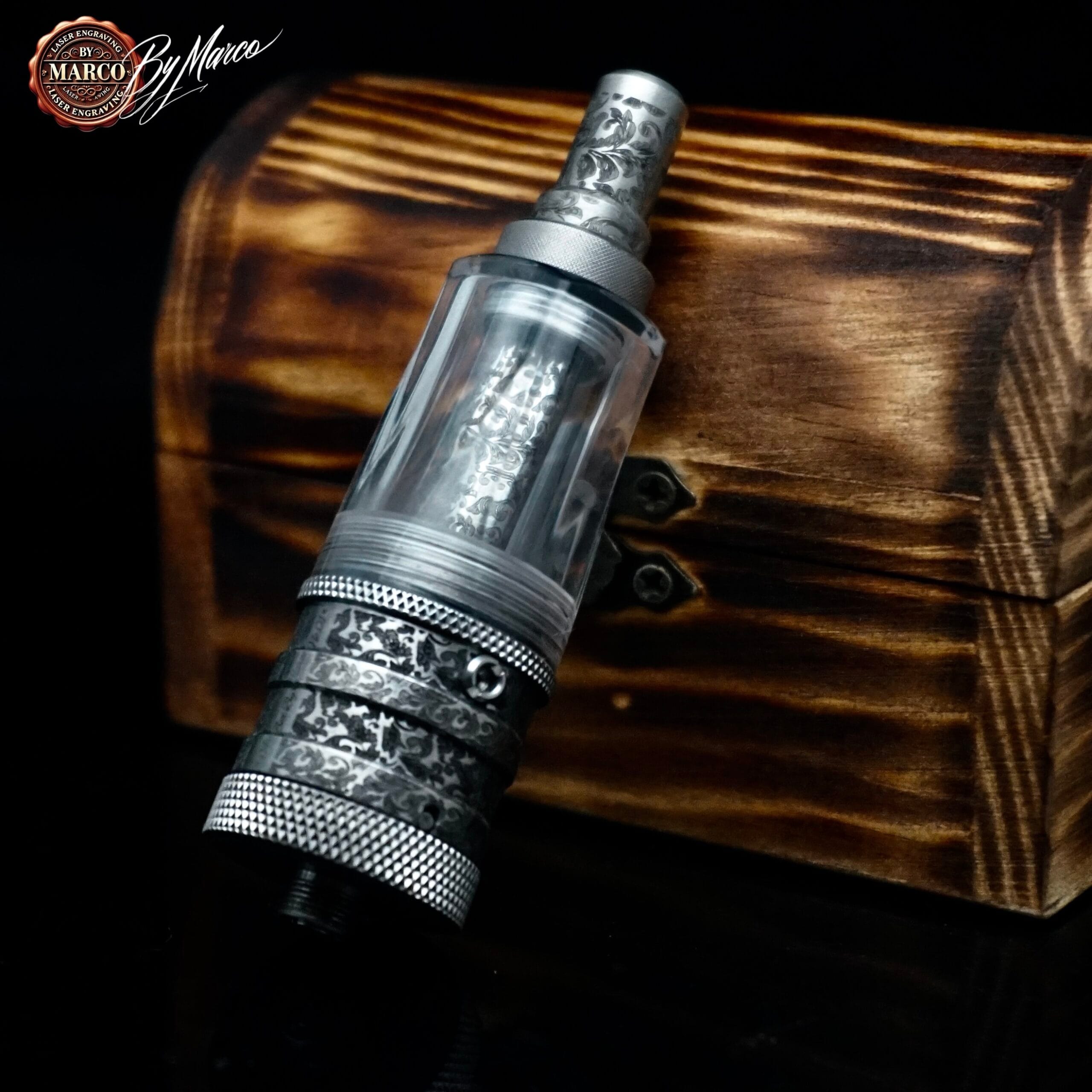 Il tank, compatibile con atomizzatore FeV e con una capienza fino a 5 ml, non è stato realizzato da me, ma è stato lavorato esteticamente per esaltarne la presenza scenica. Attraverso una tecnica di lucidatura dedicata ho cercato di conferirgli maggiore lucentezza, trasparenza e un aspetto più cristallino, così da mettere ulteriormente in risalto l’incisione e l’effetto finale dell’insieme.