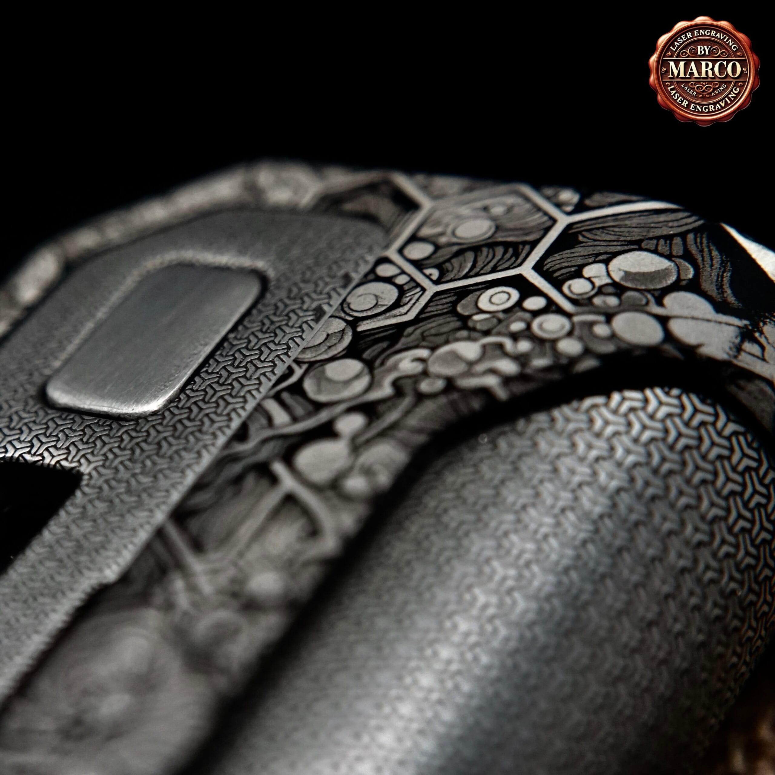 L’intera scocca è stata lavorata con incisione profonda e continua, composta da geometrie e micro-dettagli che si intrecciano tra pieni e vuoti. Il pattern, tecnico ma quasi organico, cambia lettura con la luce e crea un effetto tridimensionale dinamico, offrendo al tempo stesso un grip sorprendente e naturale in mano. Ogni linea è studiata per dare movimento senza appesantire l’estetica complessiva.