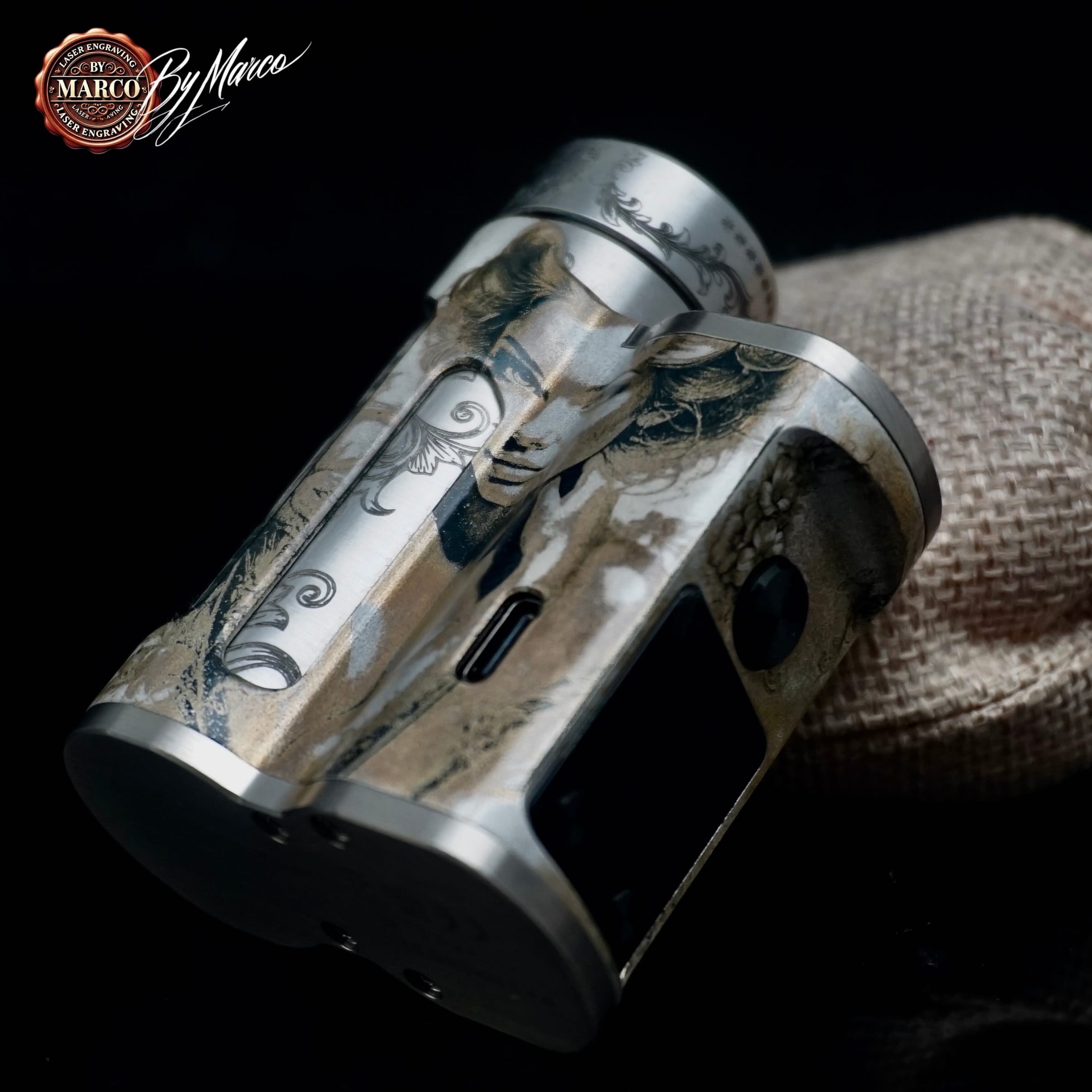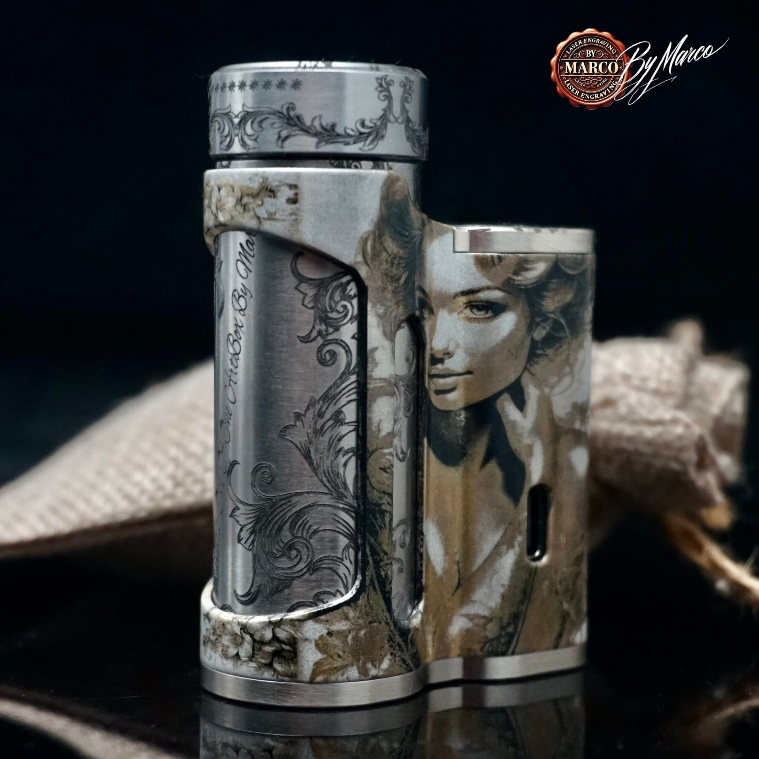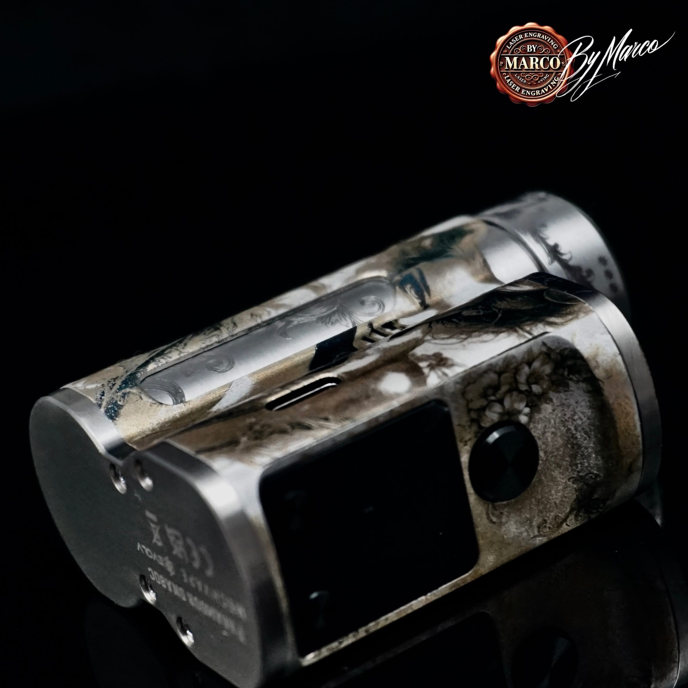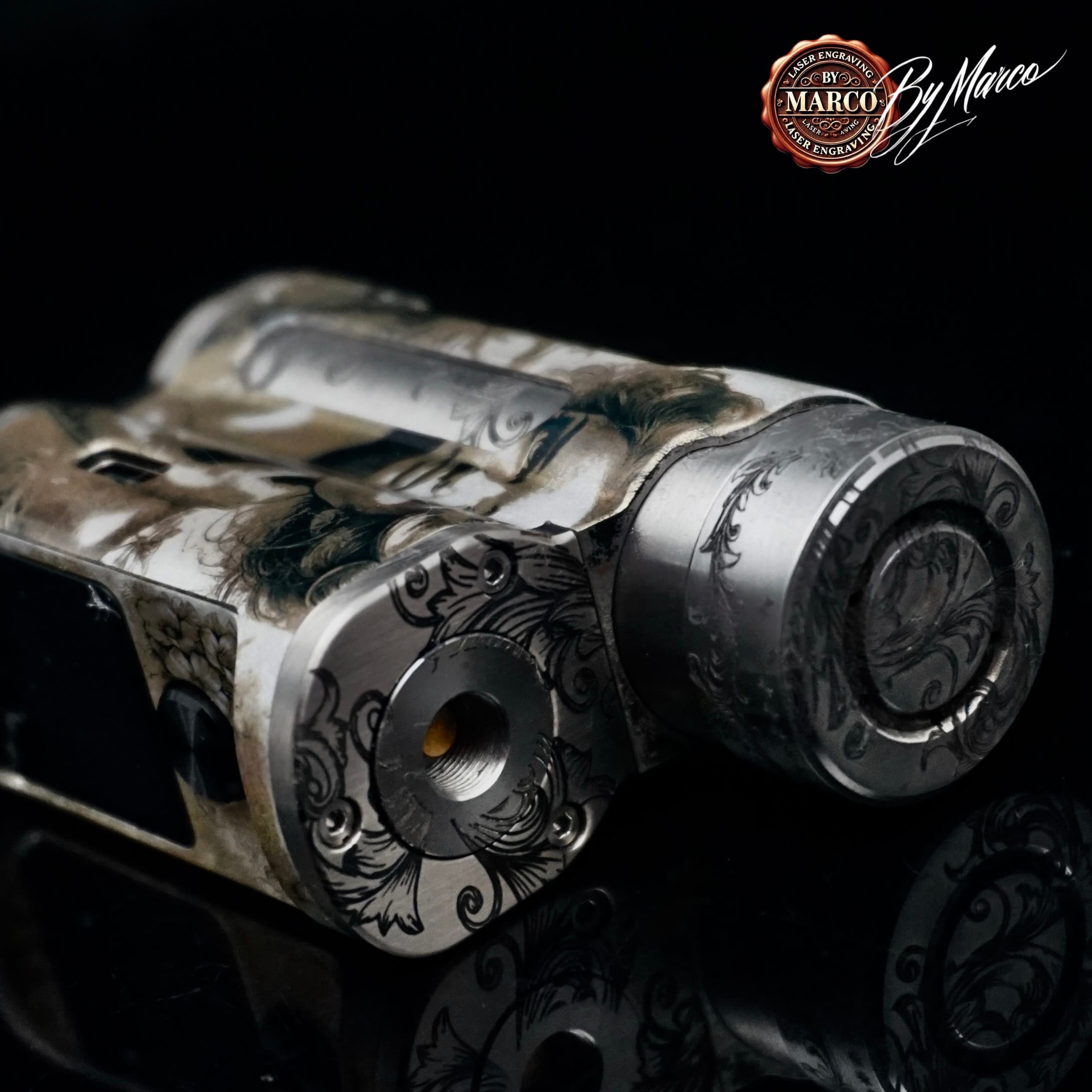 Accanto ai volti, i motivi ornamentali e floreali arricchiscono la composizione con un gusto antico, raffinato e decorativo. Le incisioni si sviluppano sulle varie parti della box, creando continuità tra corpo, tubo batteria, tazza superiore e dettagli metallici. Ogni lato offre una prospettiva diversa: da una parte il volto più intenso e profondo, dall’altra decorazioni più leggere, firme, scritte e richiami visivi che completano la narrazione.