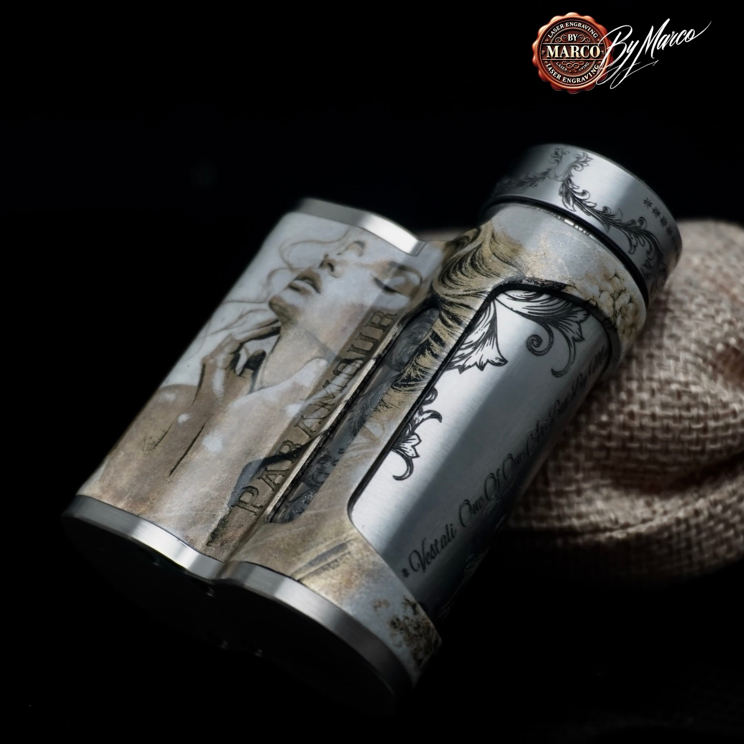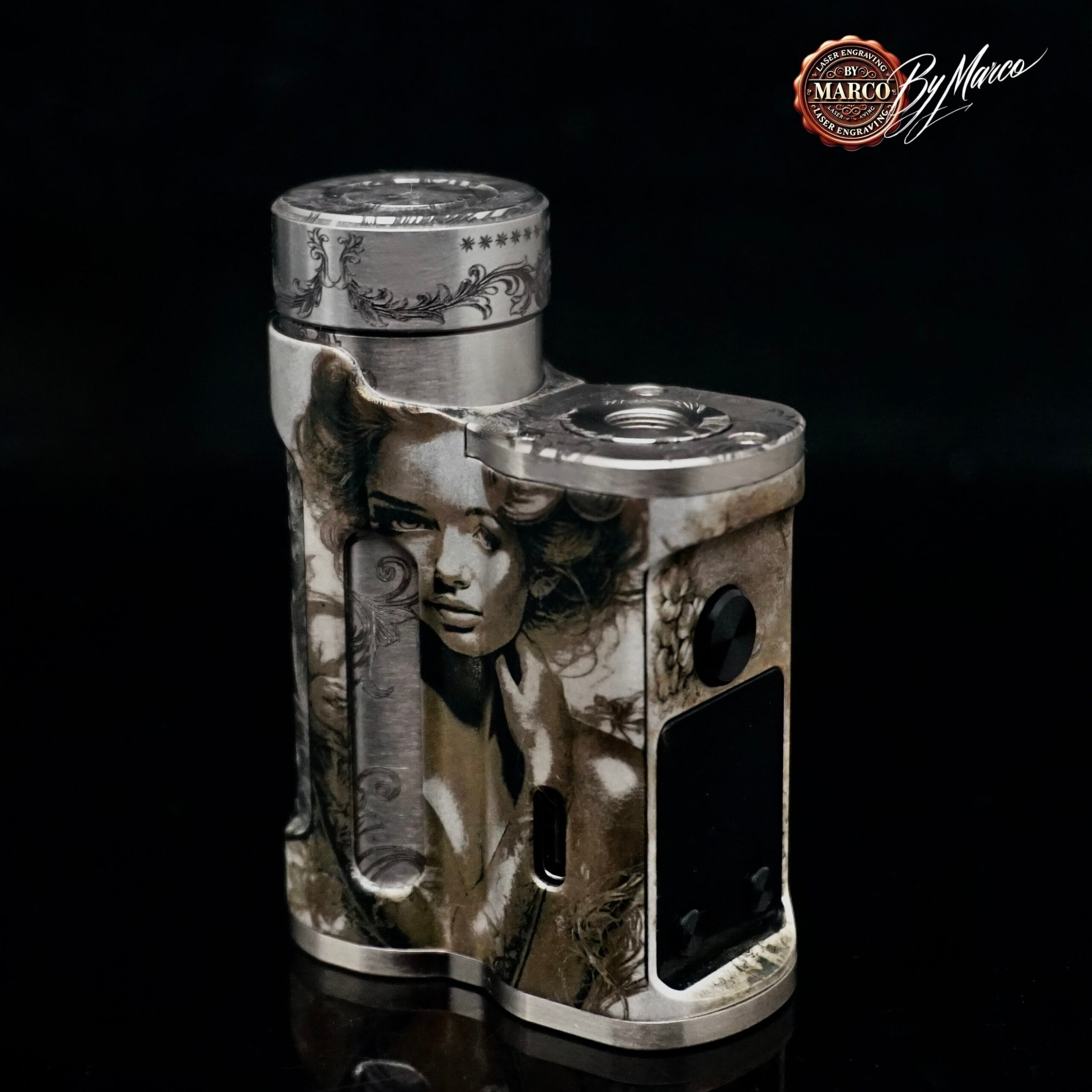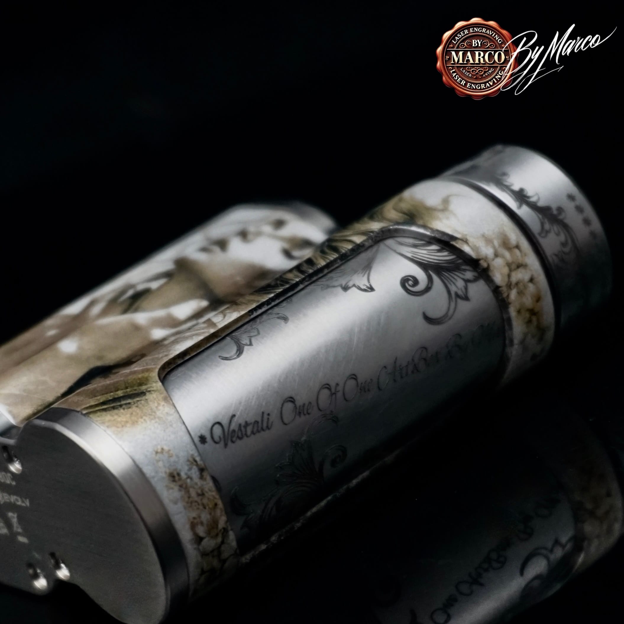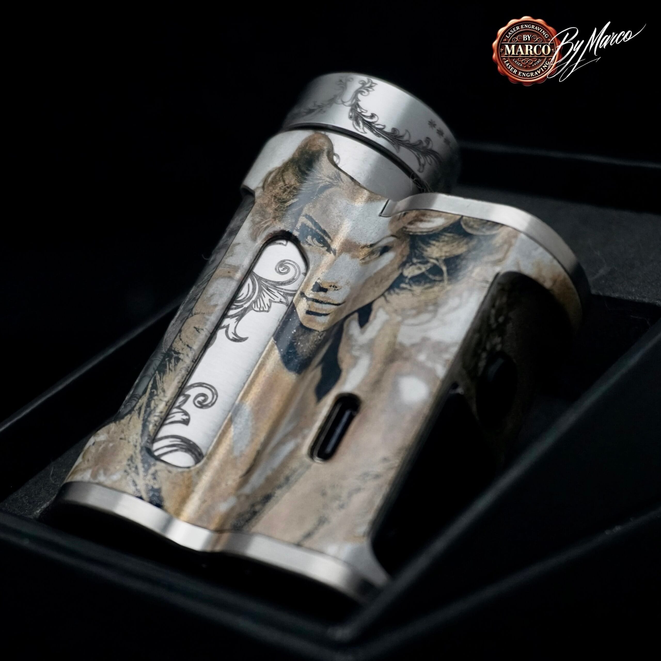Accanto ai volti, i motivi ornamentali e floreali arricchiscono la composizione con un gusto antico, raffinato e decorativo. Le incisioni si sviluppano sulle varie parti della box, creando continuità tra corpo, tubo batteria, tazza superiore e dettagli metallici. Ogni lato offre una prospettiva diversa: da una parte il volto più intenso e profondo, dall’altra decorazioni più leggere, firme, scritte e richiami visivi che completano la narrazione.