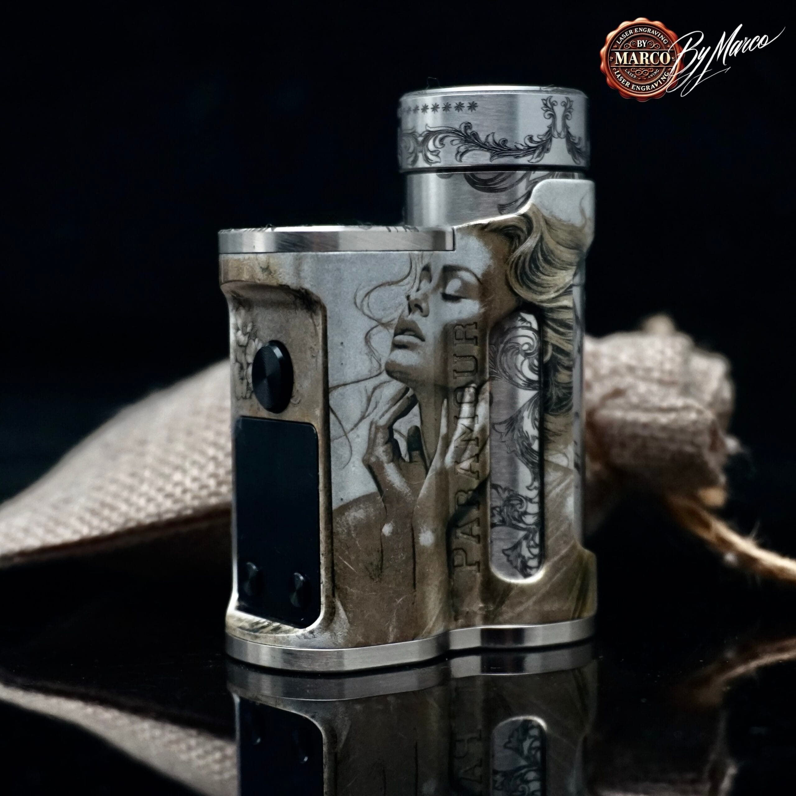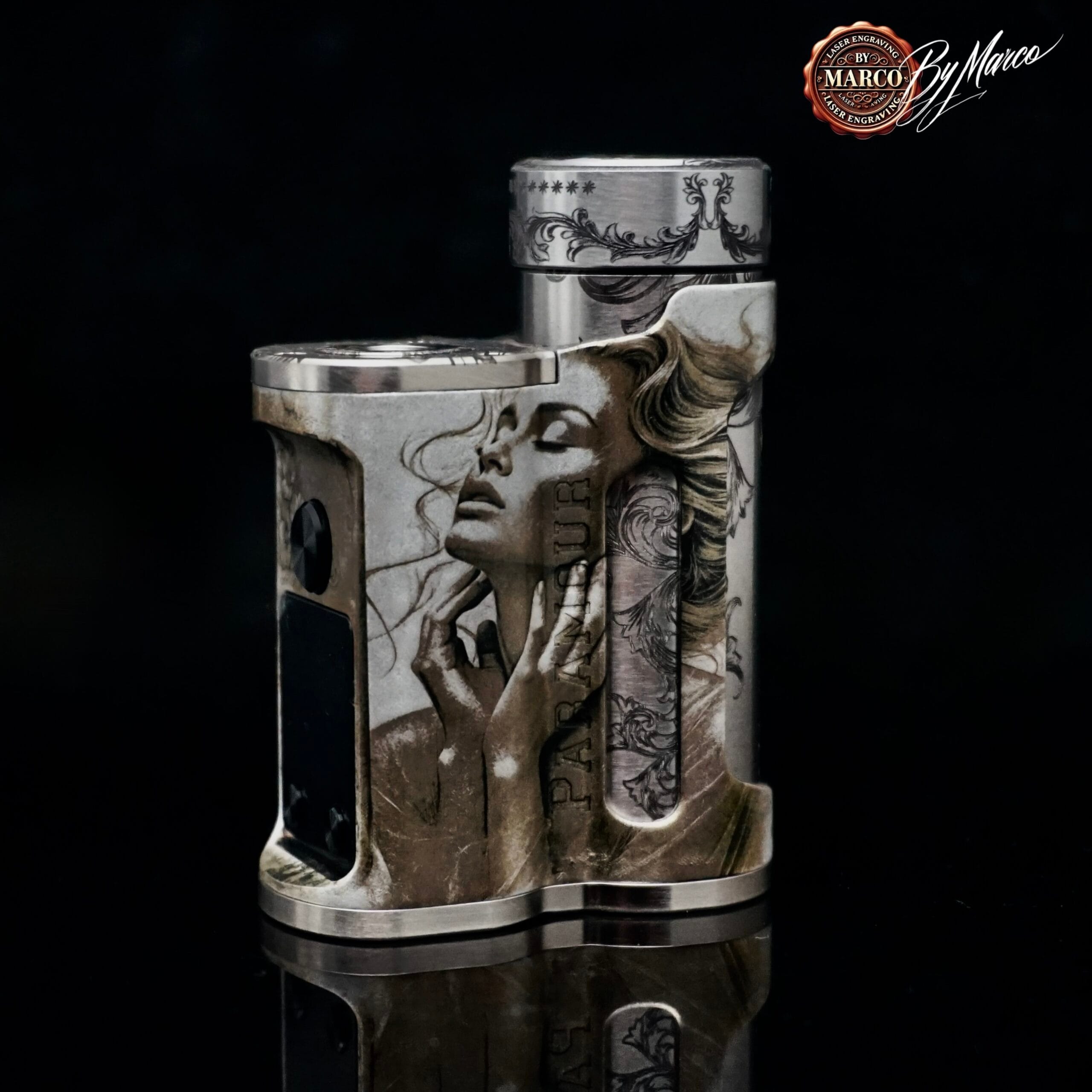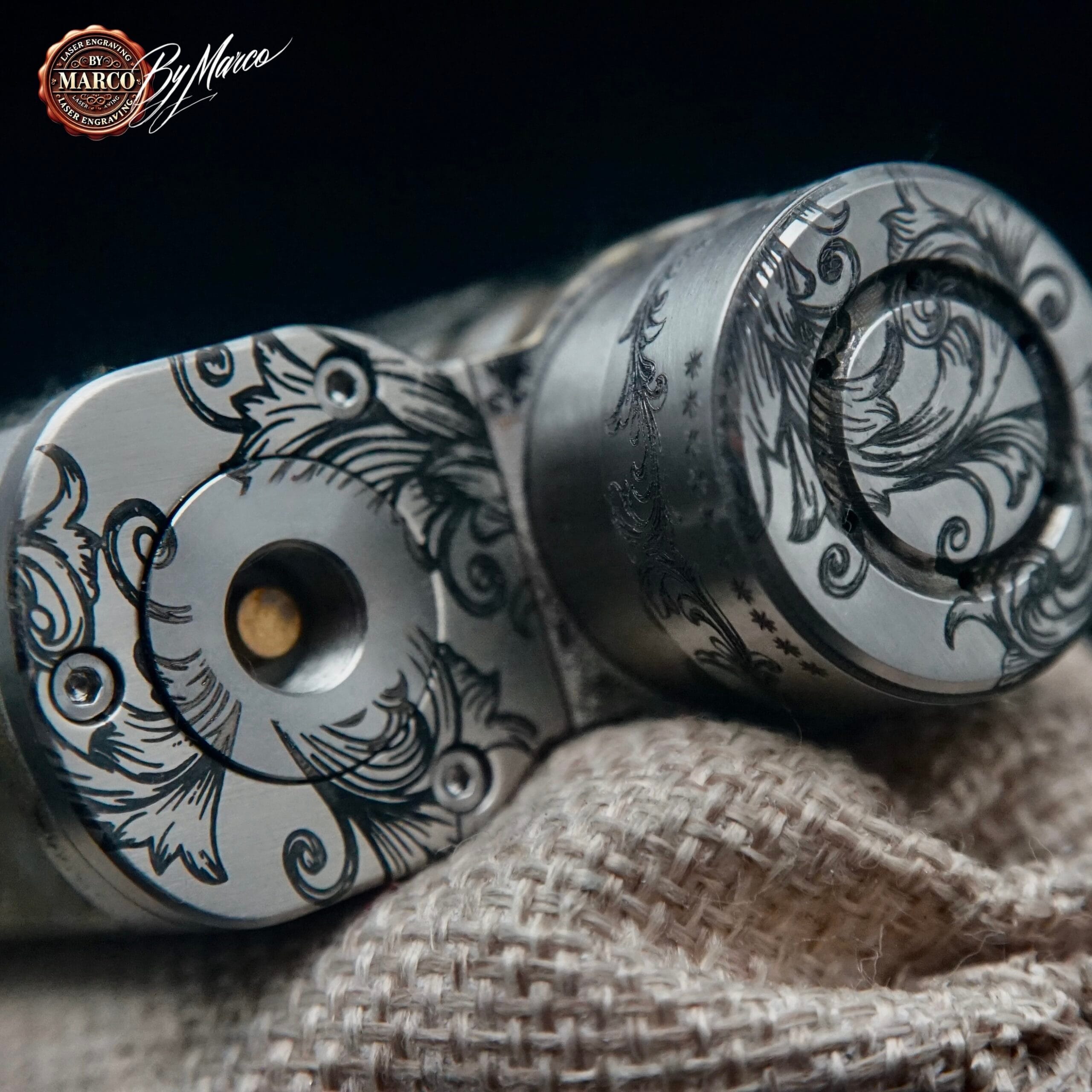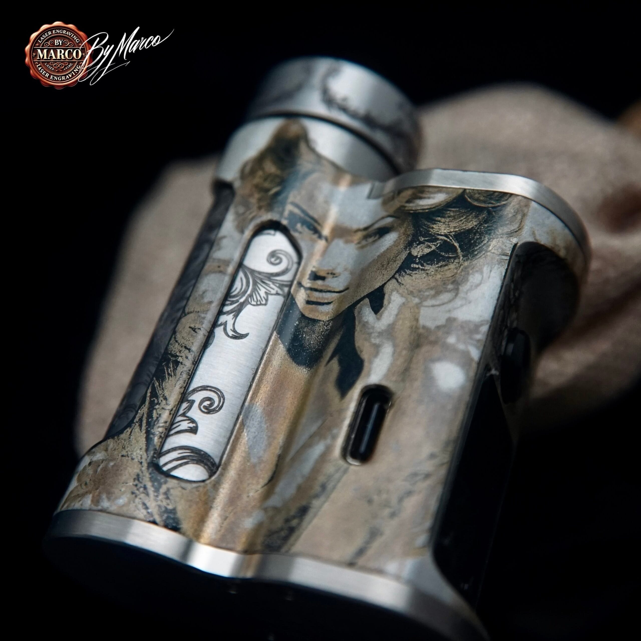 Accanto ai volti, i motivi ornamentali e floreali arricchiscono la composizione con un gusto antico, raffinato e decorativo. Le incisioni si sviluppano sulle varie parti della box, creando continuità tra corpo, tubo batteria, tazza superiore e dettagli metallici. Ogni lato offre una prospettiva diversa: da una parte il volto più intenso e profondo, dall’altra decorazioni più leggere, firme, scritte e richiami visivi che completano la narrazione.